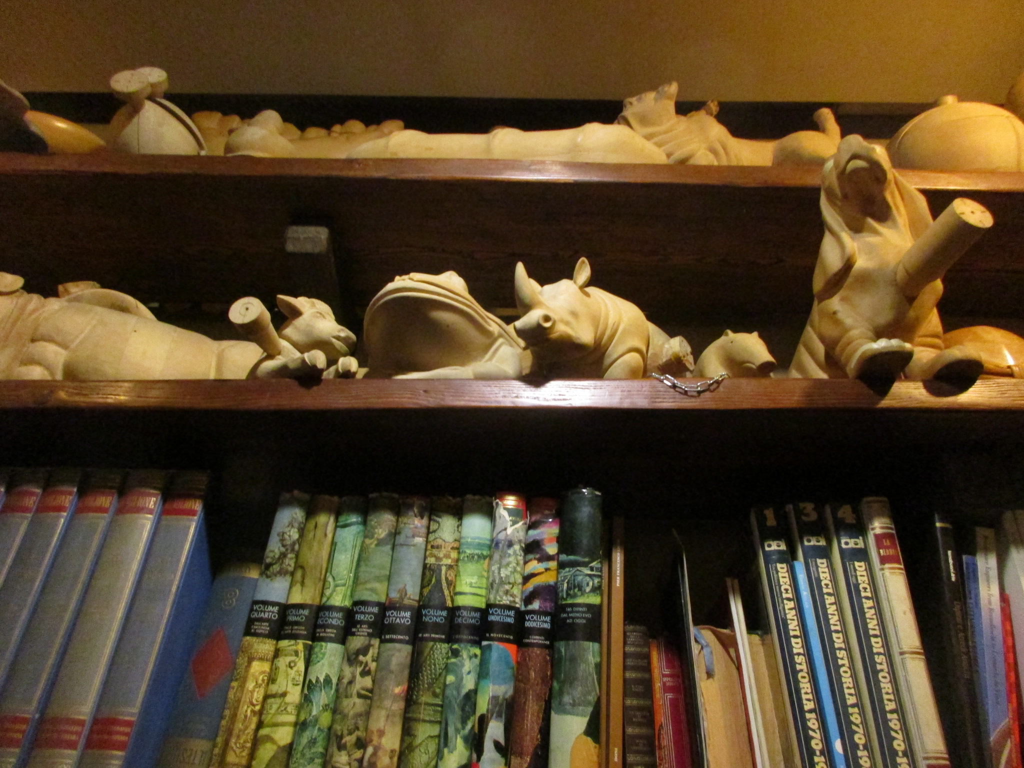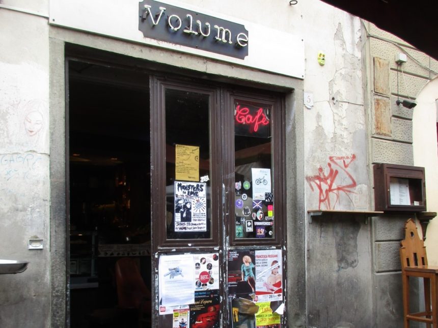 さて、そんなフィレンツェのバールの1つが、この「Volume」。アルノ川向こうの、サントスピリト広場の中にあります。TOPの写真のように、ちょっと退廃的な?地味~な店構え、ですが・・・中に入ると、ギャラリーのようなちょっと特殊な空間が広がります。