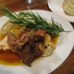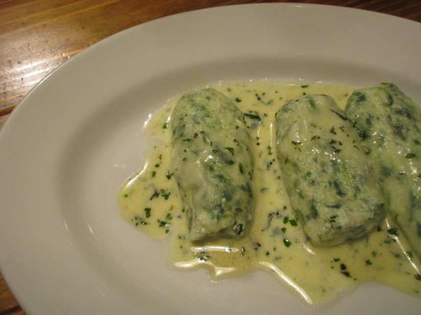 プリモ=パスタやリゾット、スープなどの、第一の皿。今年のプリモは、日本ではほとんど見かけない!NUDI=ニューディ。リコッタチーズとほうれん草のお団子なんですが、これ、よくラヴィオリに入ってる具なんですね。パスタの皮を脱いで裸になった=ヌード NUDOの複数形でニューディという名前がついてるんです(笑)トスカーナではよく食べる料理なのですが、牛乳のリコッタでなく、ここではマレンマと同じように羊乳のリコッタを使用。私はトマトソースで食べることが多いのですが、ここでは激ウマのハーブの効いたバターソース!これはちょっと衝撃的な美味しさだったので、イタリアに帰ったら早速真似させて頂こうと思います(笑)