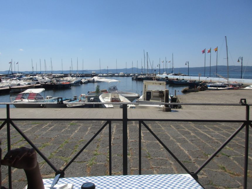 旅行、お出かけの楽しみの1つはやっぱり食(笑)。今回はラツィオ州のボルセーナ湖に行ったわけですが、州は変わったとはいえ、たった1時間ちょっとの距離。肉料理なんかはそんなに変わらないのですが、ここは湖!なので、湖畔のレストランならではの料理を堪能したい!湖畔沿いの3~4軒のレストランを見比べて、メニュー&価格、そして港ビューってのもやっぱり気に入ってこの Da Guidoに入りました。中のインテリアもとっても可愛かったのですが、中は空っぽ~。やっぱり港が近く見えるテラス席(屋根、日よけあり)が人気です。
