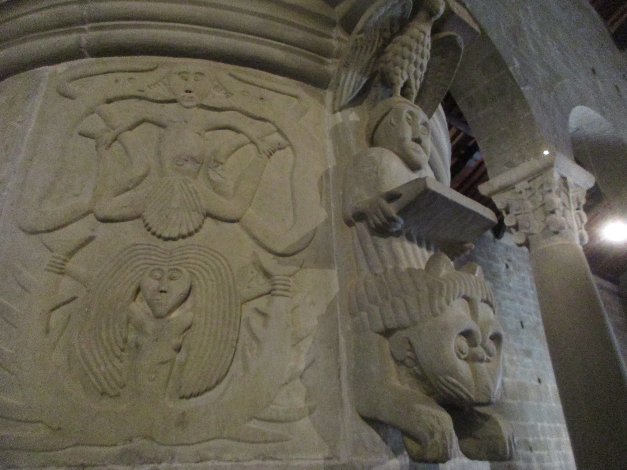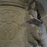全体像を見たら、柱上の彫刻にも注目してみましょう。入って左側の柱は新旧の聖書について、右側の柱は初期キリスト教・エトルリア文化・東洋芸術からイスピレーションを受けたテーマとなっています。そして、右側にあるのが13世紀頃の説教壇。ねじりの入った柱は、後陣外側と同じデザインになっています。