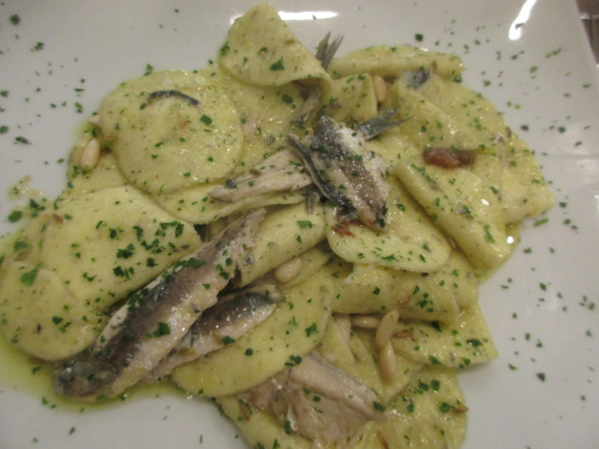 その地のものが食べたい私は、TOP写真の 「コルツェッティのモンテロッソ風」に即決!どうやらモンテロッソはイワシが有名なようで、このパスタもイワシ、松の実、レーズン、パン粉、フェンネルシードで和えてあります。そしてコルツェッティはリグーリアの円形パスタで、スタンプで押した柄ものもあり、それを楽しみにしていたのですが・・・柄なし(涙)しかし、このパスタをはがしても、はがしても、イワシやパスタがとめどなく出てくるほどのボリュームがあり、とても美味しかったので良しとします!