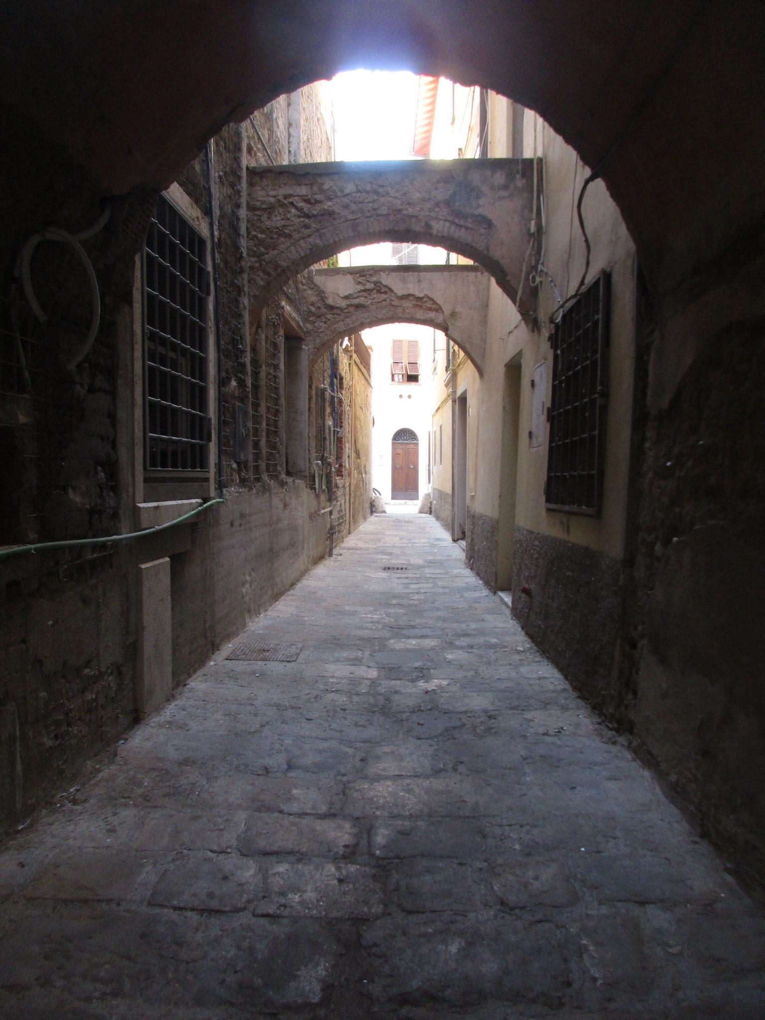 オルベテッロにズームすると分かって頂けると思うのですが、運河によって、町は左右2つに区画されています。右側が最近のマンションやスーパーなどがある、いわゆる「新市街」。運河から少し行ったところにあるTOP写真の城塞門を抜けると左側・「旧市街」に入り、昔ながらの町並みに市役所や教会があります。