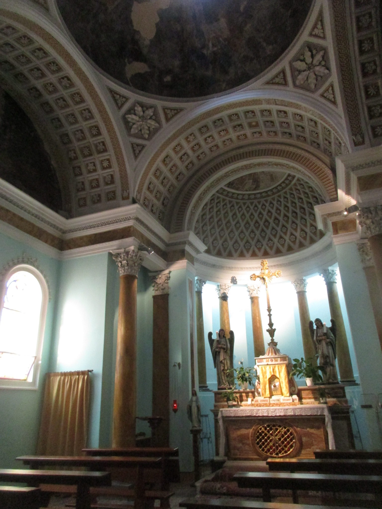 一方、こちらは旧市街の西の端に近い所にある、町のドゥオモ、サンタ・マリア・アッスンタ教会。市役所広場からはほんの数分ですが、観光客よりも地元民の方が多く、穏やかな空気が流れています。教会の歴史は古く、元々は5世紀に建てられたローマ時代の教会の遺構に建てられた教会で、13世紀以降に拡張と装飾が加えられ、現在に至ります。ファサートはバラ窓と精巧な彫刻で飾られ、一方、中は海を彷彿させる白と水色の色調になっています。