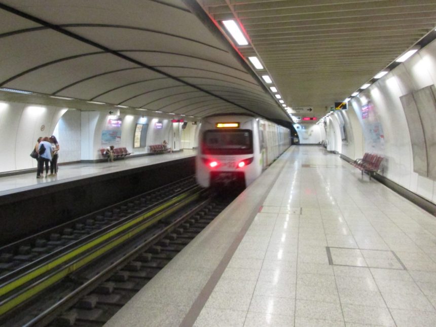 こんなMのマークがあるのが、地下鉄駅。駅名はギリシャ現地語と英語が併記になっており、アナウンスもギリシャ語・英語の2か国語で行われます。