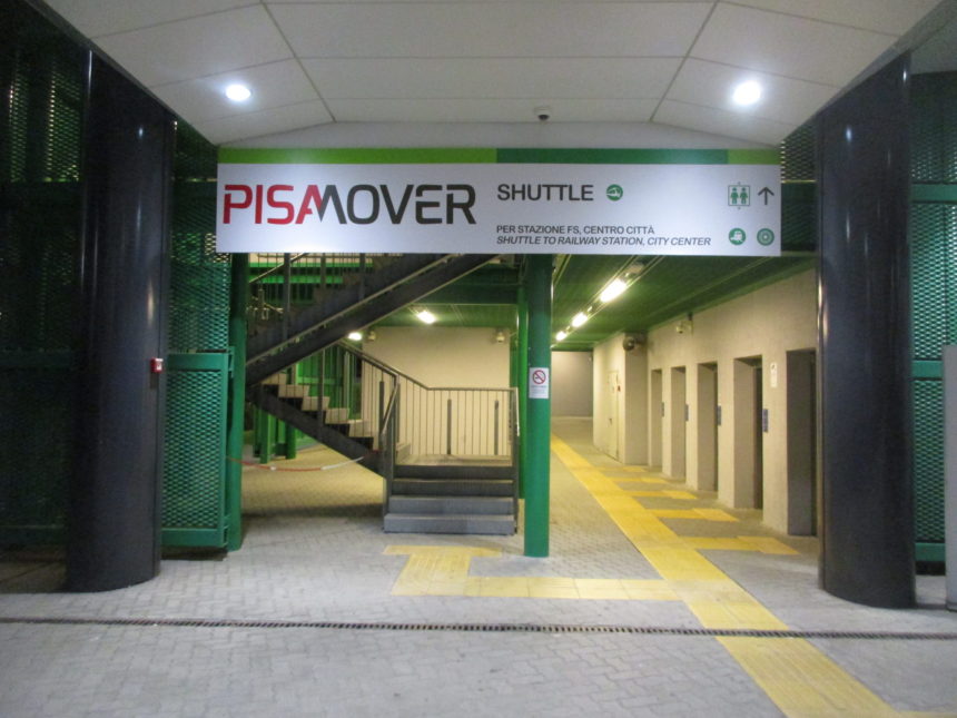 ピサ空港のPISAMOVER駅も空港内の表示に従うだけ~出発側の端っこから出て、外の通路をひたすらまっすぐ、エレベーターに乗ってホームへ。