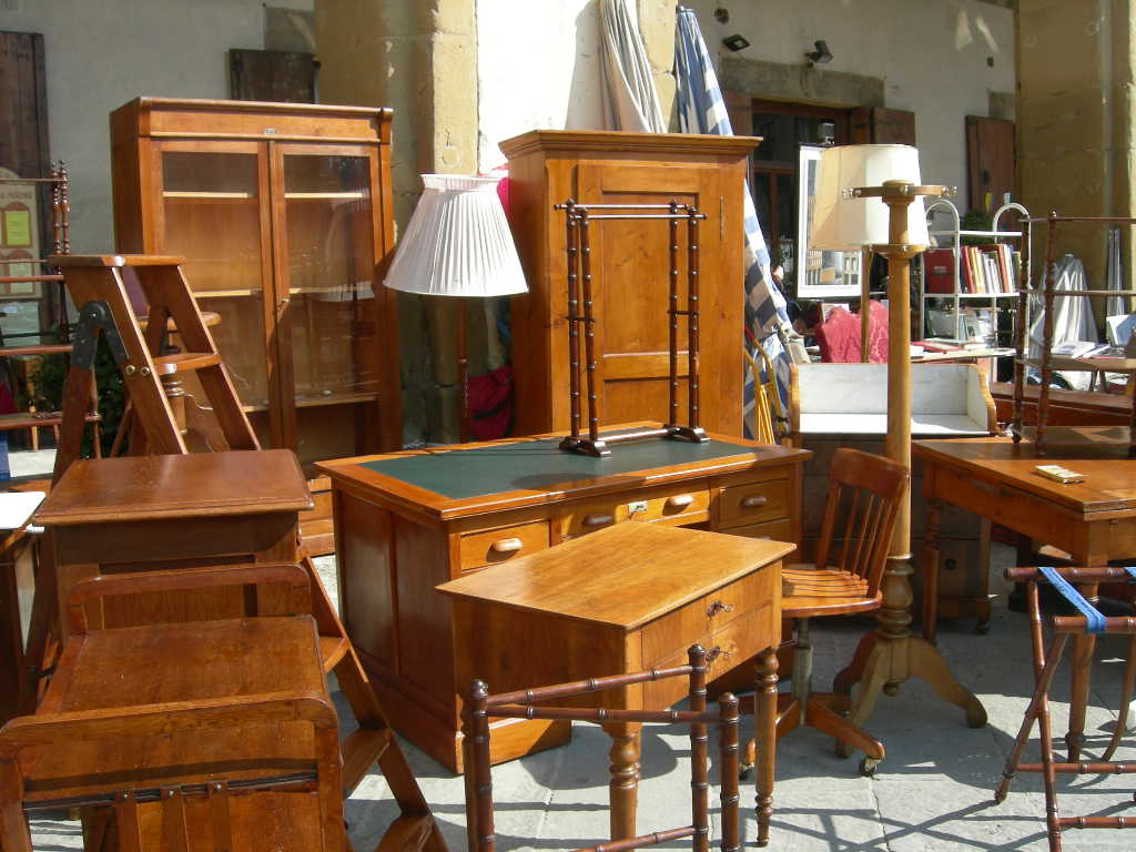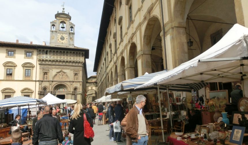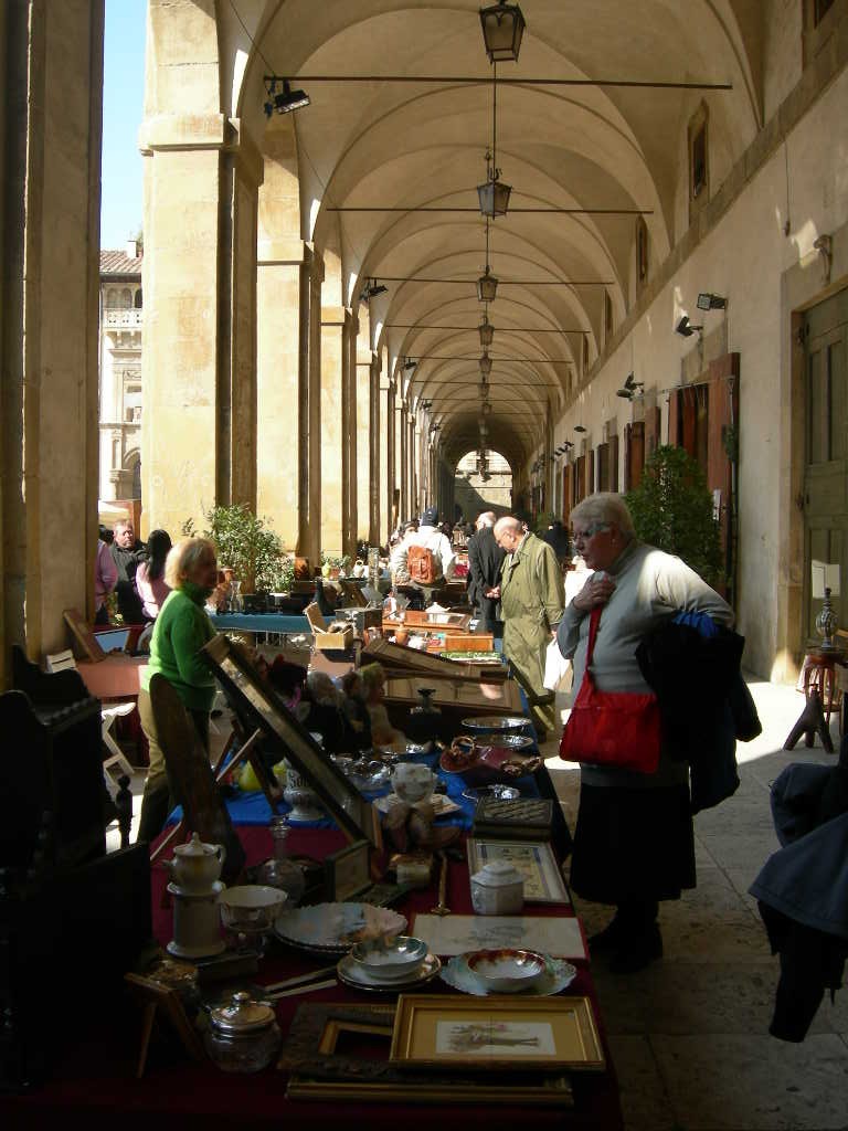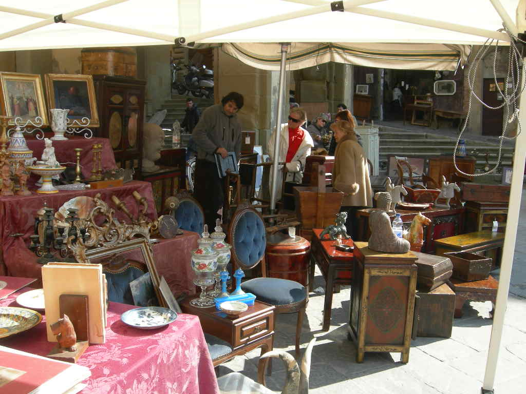 主要5都市 の中にも書いてますが、アレッツォはフィレンツェから一時ほどの中規模の町。ほど良い大きさで観光の見所もあり、路地などの散策も楽しい、素敵な町です。イタリアでは様々な町で大小のアンティーク市がいろいろありますが、 アレッツォのアンティーク市は最も古い、最も大きなもの だそうです。一般人もいれば、アンティークショップのプロの買い付けまで・・・リピーターのお客様のお一人もほぼ毎年、この市に買い付けにいらっしゃいます。以前に聞いた話によると、骨董屋や雑貨屋などのプロの買付は、土曜日の朝に集中するらしいです( アンティーク市は毎月第一日曜日とその前日の土曜日 )。この為にアレッツォを訪れるもよし、観光ついでに冷やかすのもよし、見ているだけでも楽しいアンティーク市です。この市の発案は、アンティーク愛好家のイヴァン・ブルスキ ( イヴァン・ブルスキ財団 が今でもあり、彼の収集品などを展示するミュージアムもあります)さんで、ロンドンのポルトべッロアンティーク市に感銘を受けて、 1968年6月2日に第一回目が開催。50年の歴史もあります。