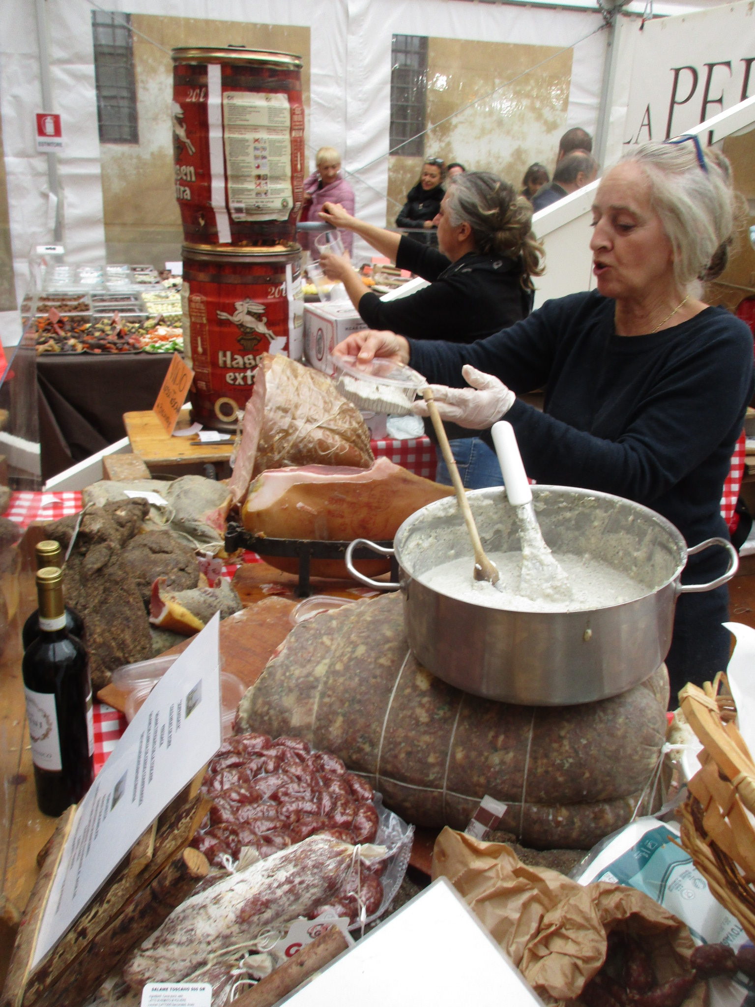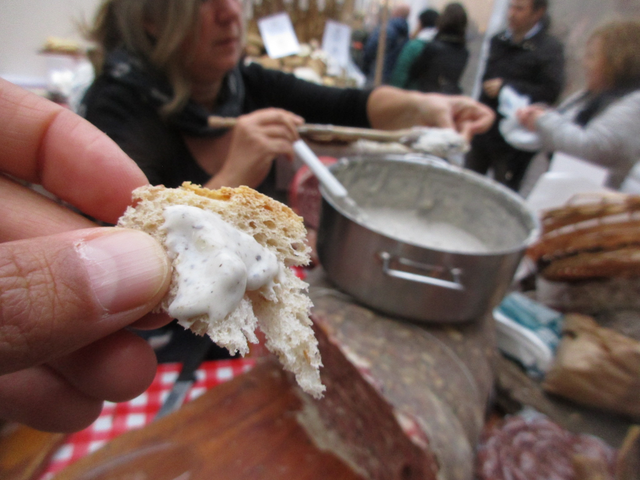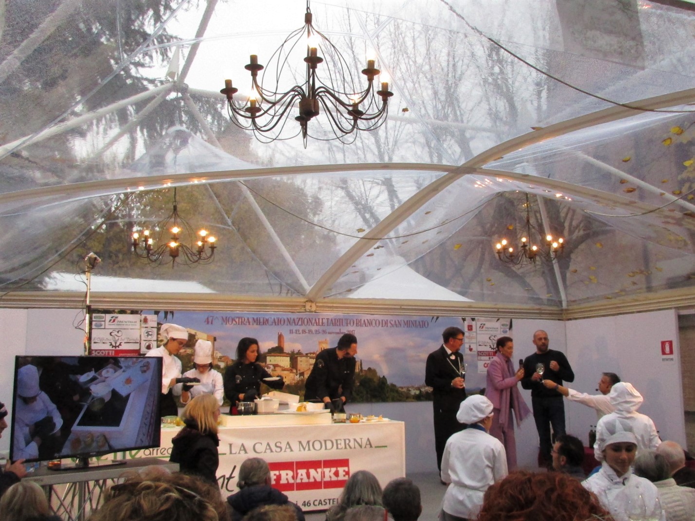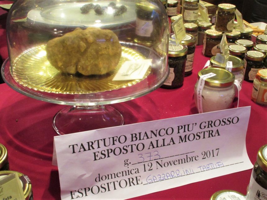 このテントの中には、トリュフ業者が所狭しとブースを並べ、まさにトリュフ一色!こんな数の生のトリュフはなかなか見る古都さえできません!ちなみにTOP写真は2017年のこのお祭りで一番大きな白トリュフ、373g!この上の写真程度のトリュフで70ユーロ程度だったので、その10倍くらい?考えただけでも目が周りそう!