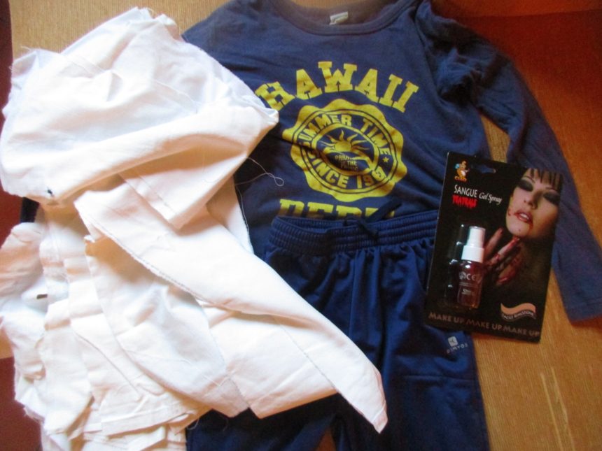これではキレイすぎるので、その後、少し破いたり、庭の枯れ葉や炭にこすりつけたり、市販品のウソもの血を吹き付けたりし・・・そして外は寒いので中にちょうどよい色合いのグレーのパーカーを、カーニバルの時に交わされた吸血鬼の歯と死神の杖?を持ち、ミイラの完成・・・なりきってます(笑)。