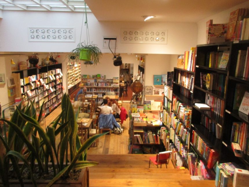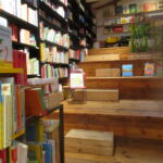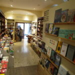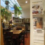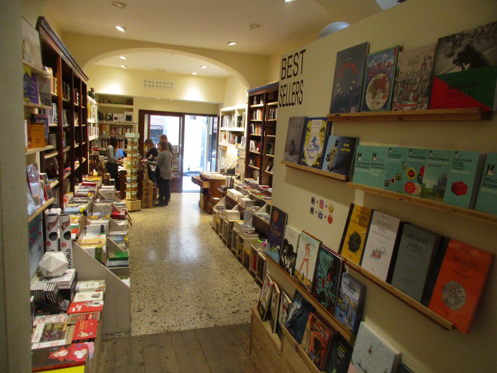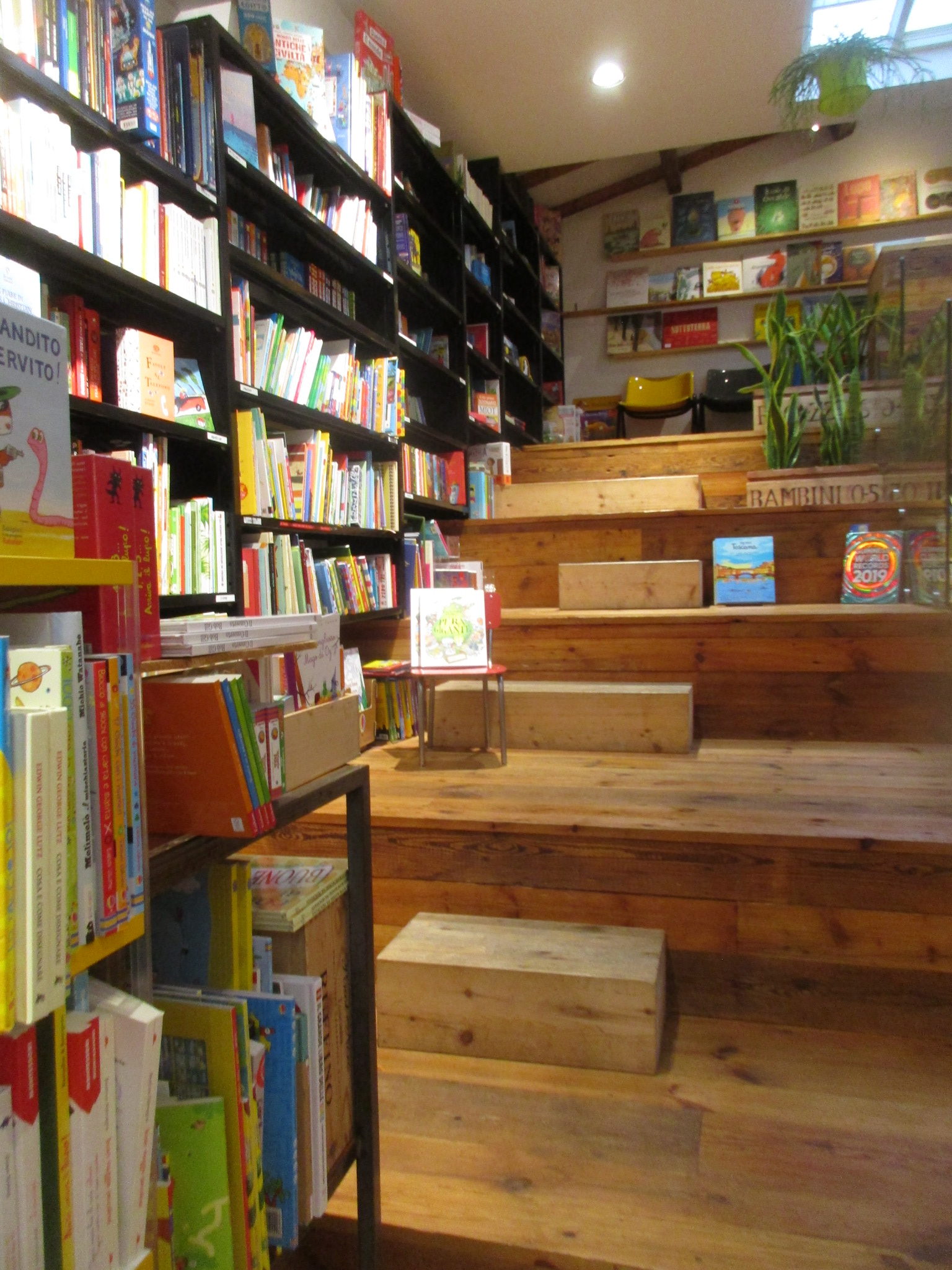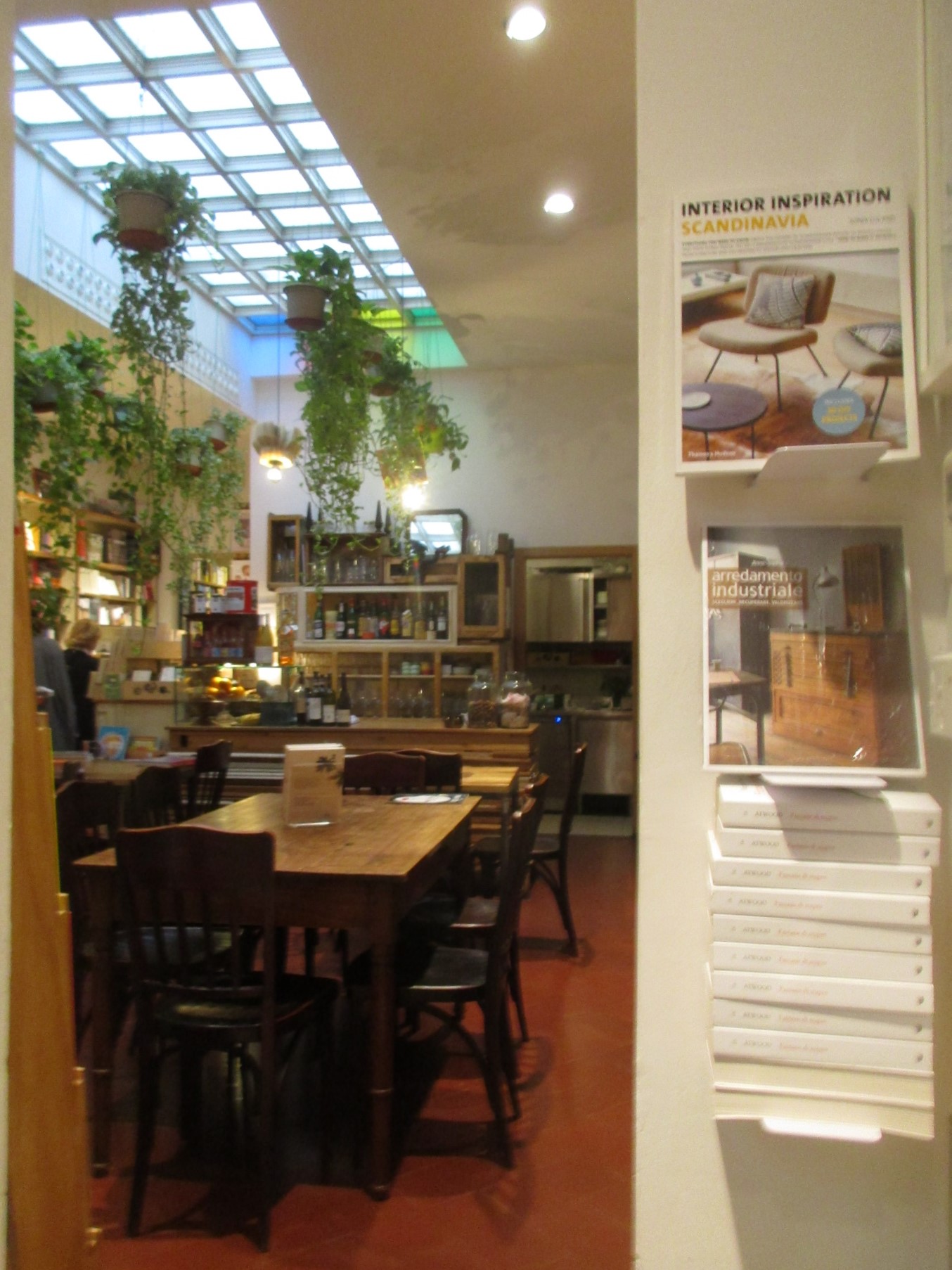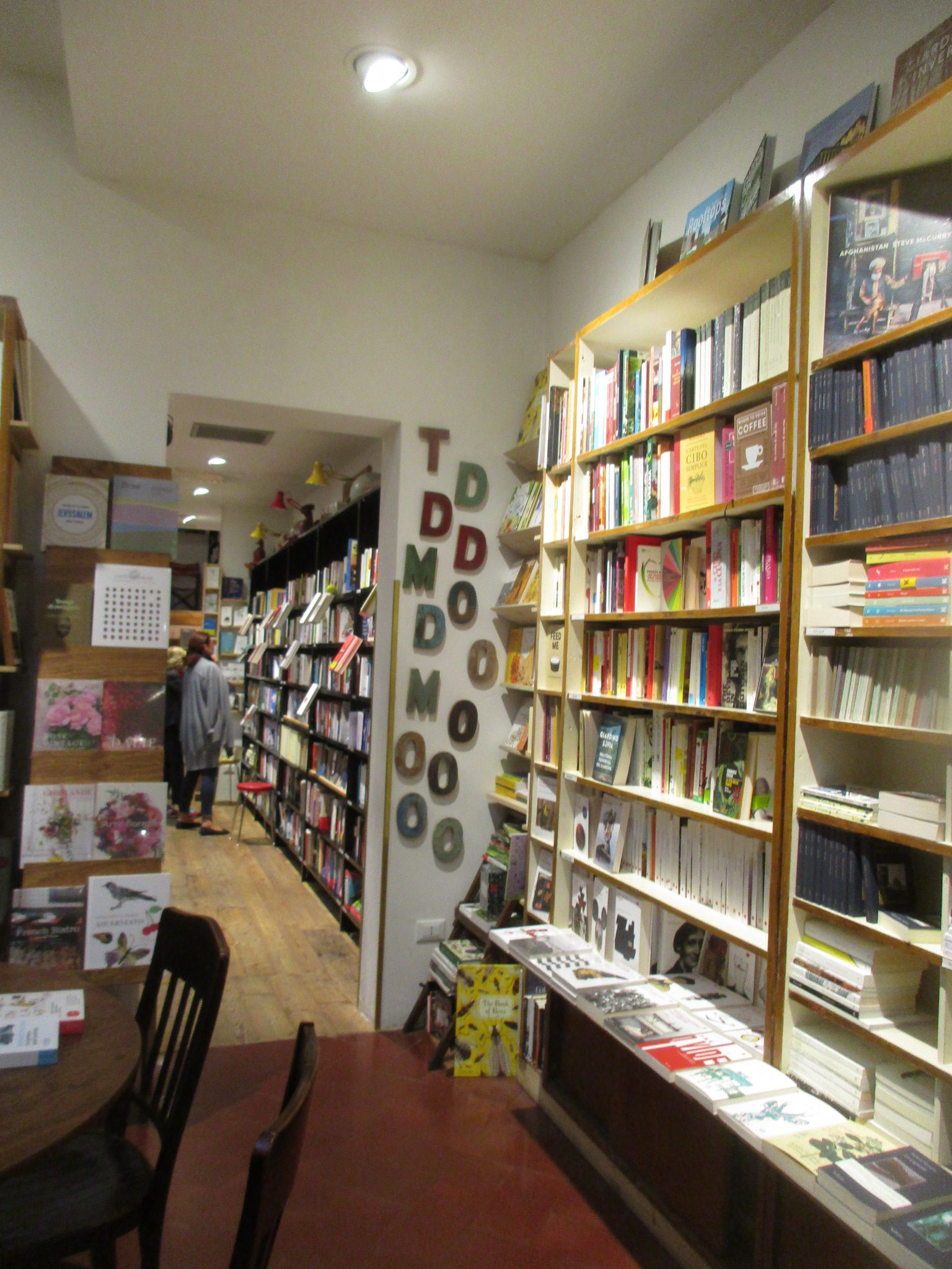 最近よくある、本屋さんの中のカフェです。看板に libiri, caffe’, teatro とあるように、上映会などのイベントもされているよう。ご覧のように間口は狭いのですが、奥まで入ってUpbar→の方向へ行くと、けっこう広いスペースのカフェが。壁は全て本棚、奥の階段まで本棚がありますが、そこにもテーブル席やクッションがあったりして、本好きさんにはこの中に身を置くだけでもたまらないんじゃないでしょうか?