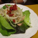 友人はBIOのワインしか飲めないけど・・・もちろんあります!と出してくれたピエモンテのスッキリとしたワイン。私はニシン燻製とシトロン、もともと魚が食べたい!と言っていた友人はサバのサラダ。どちらも見た目も美しく、ヘルシー!