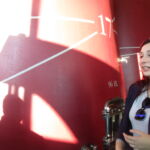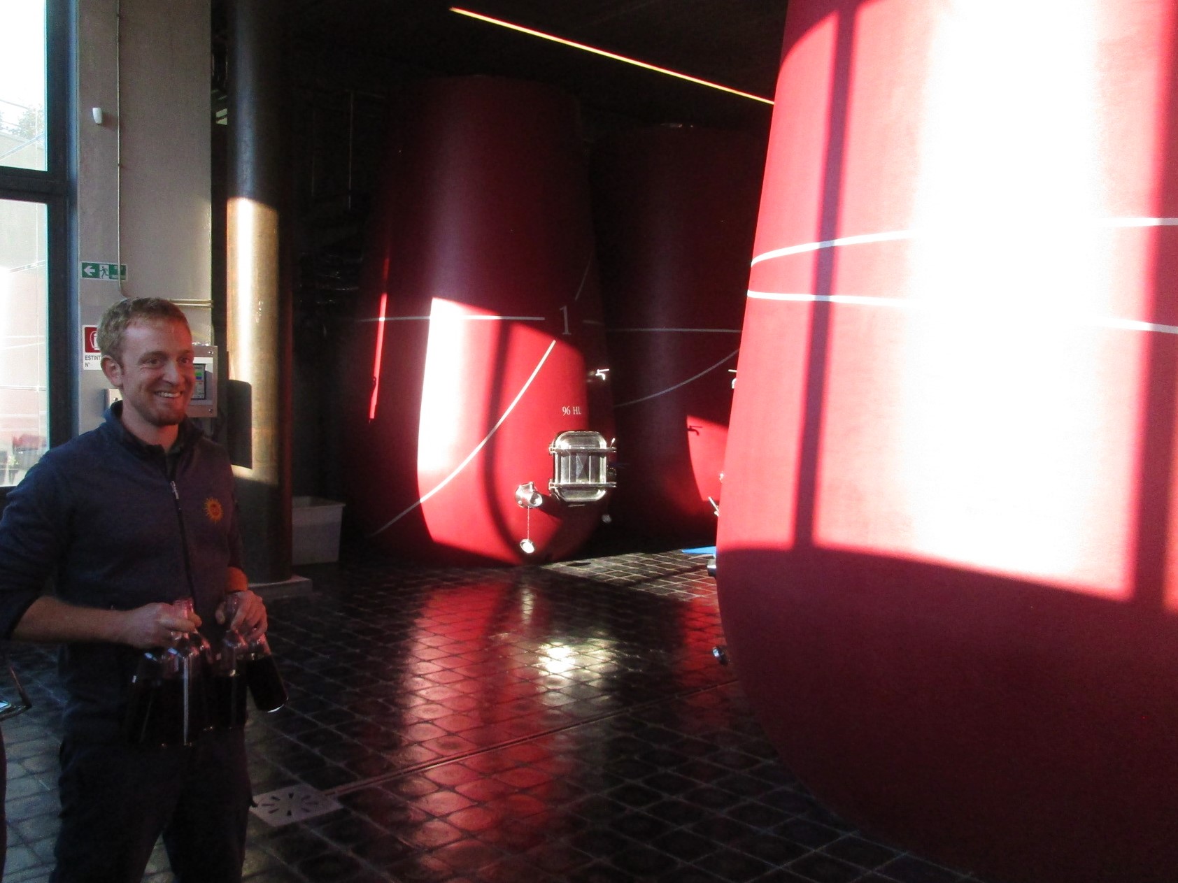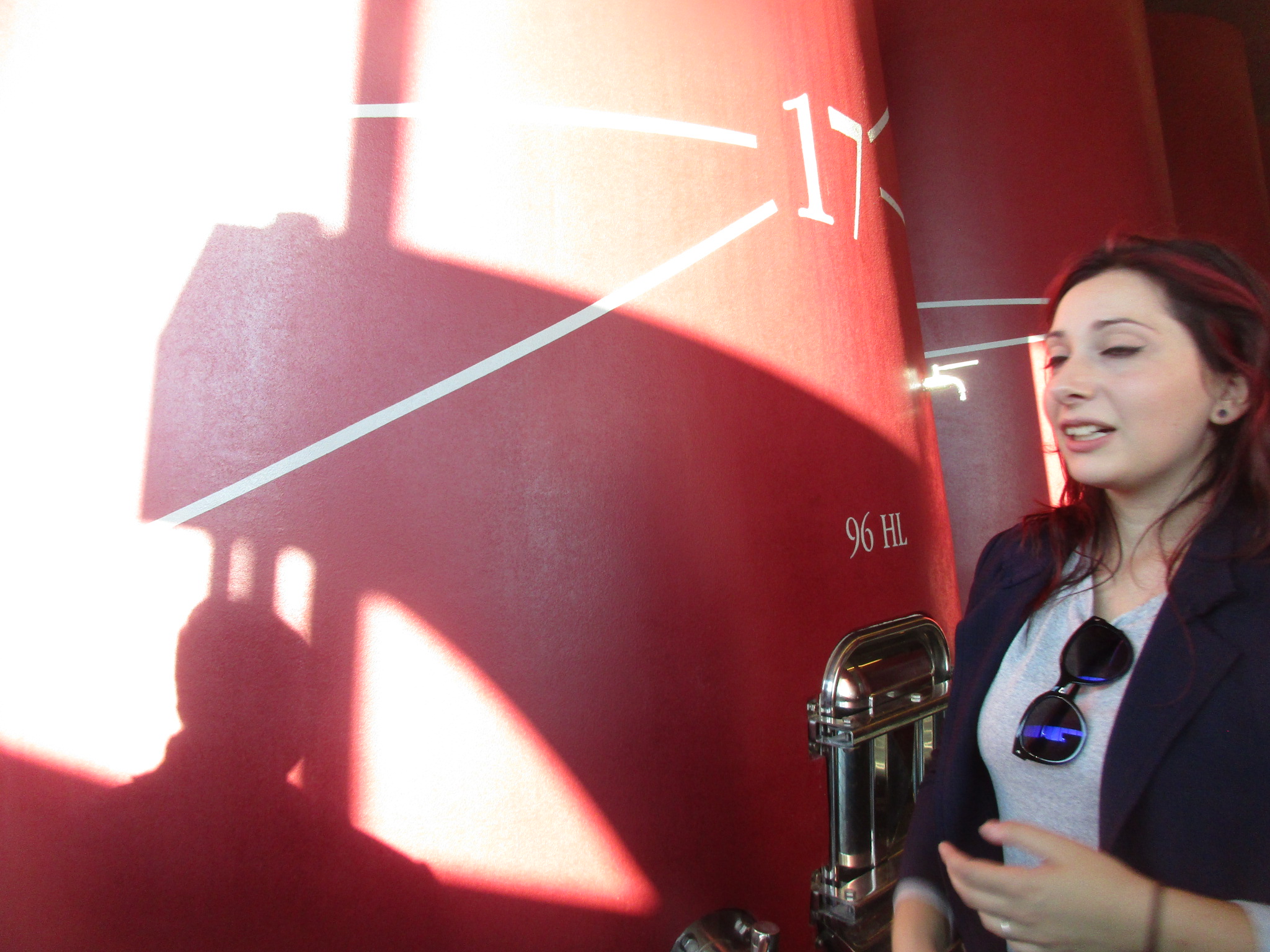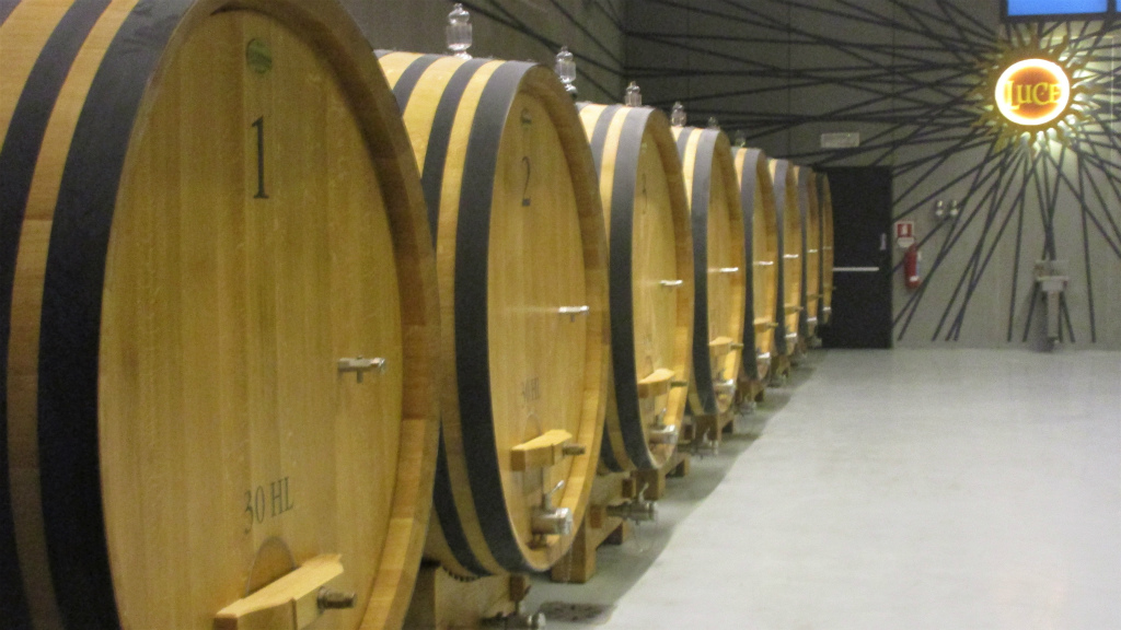 ワイン生産というと木樽を想像する方が多いと思いますが、こちらのワイナリーはセメントも・・・しかも、ぉの形と言い、色と言い、大きなワイングラスのよう。ルーチェのマークと呼応する光線模様は、各セメント容器ごとに微妙に違っています。そして当然、木製樽もあります!