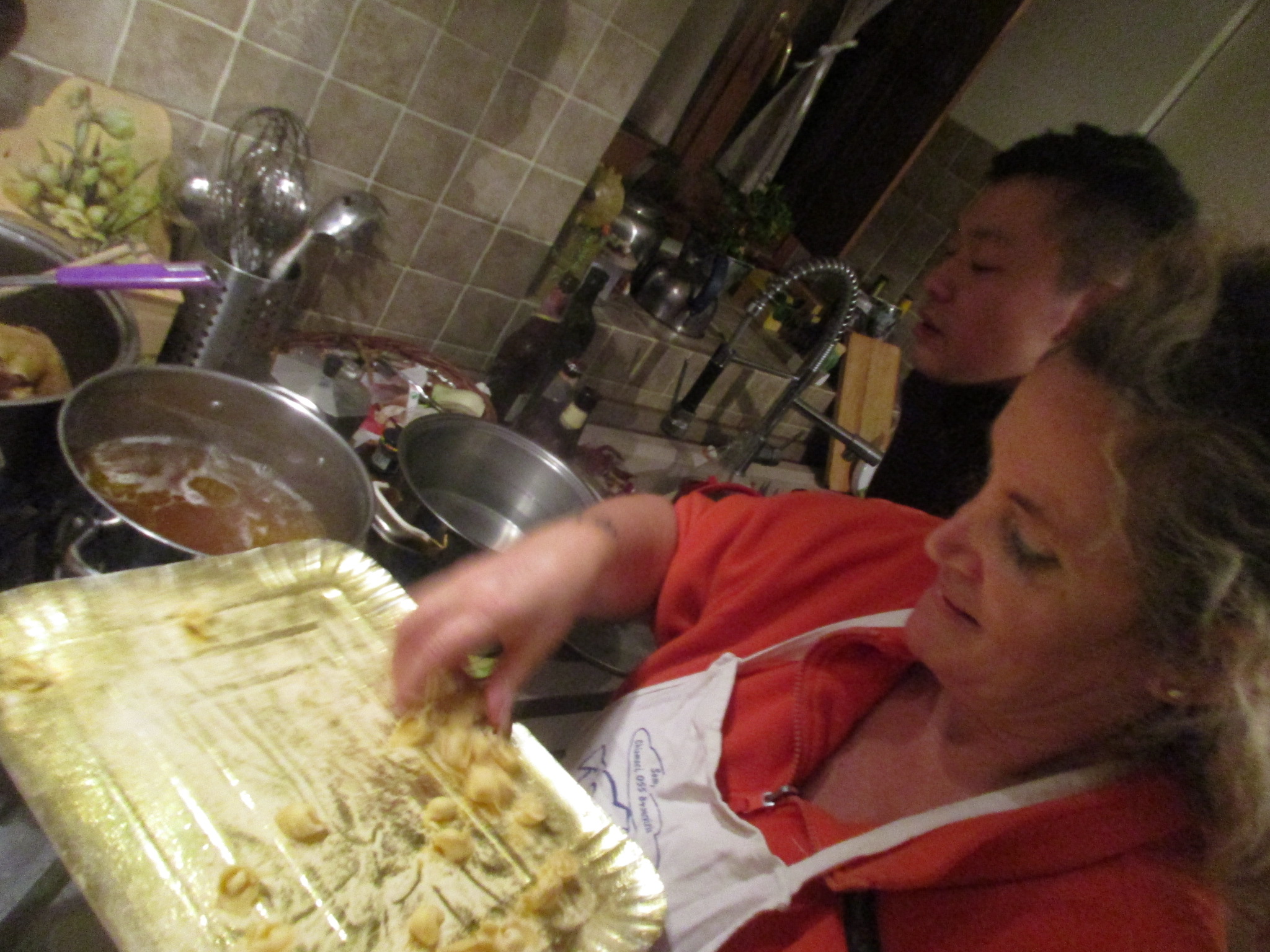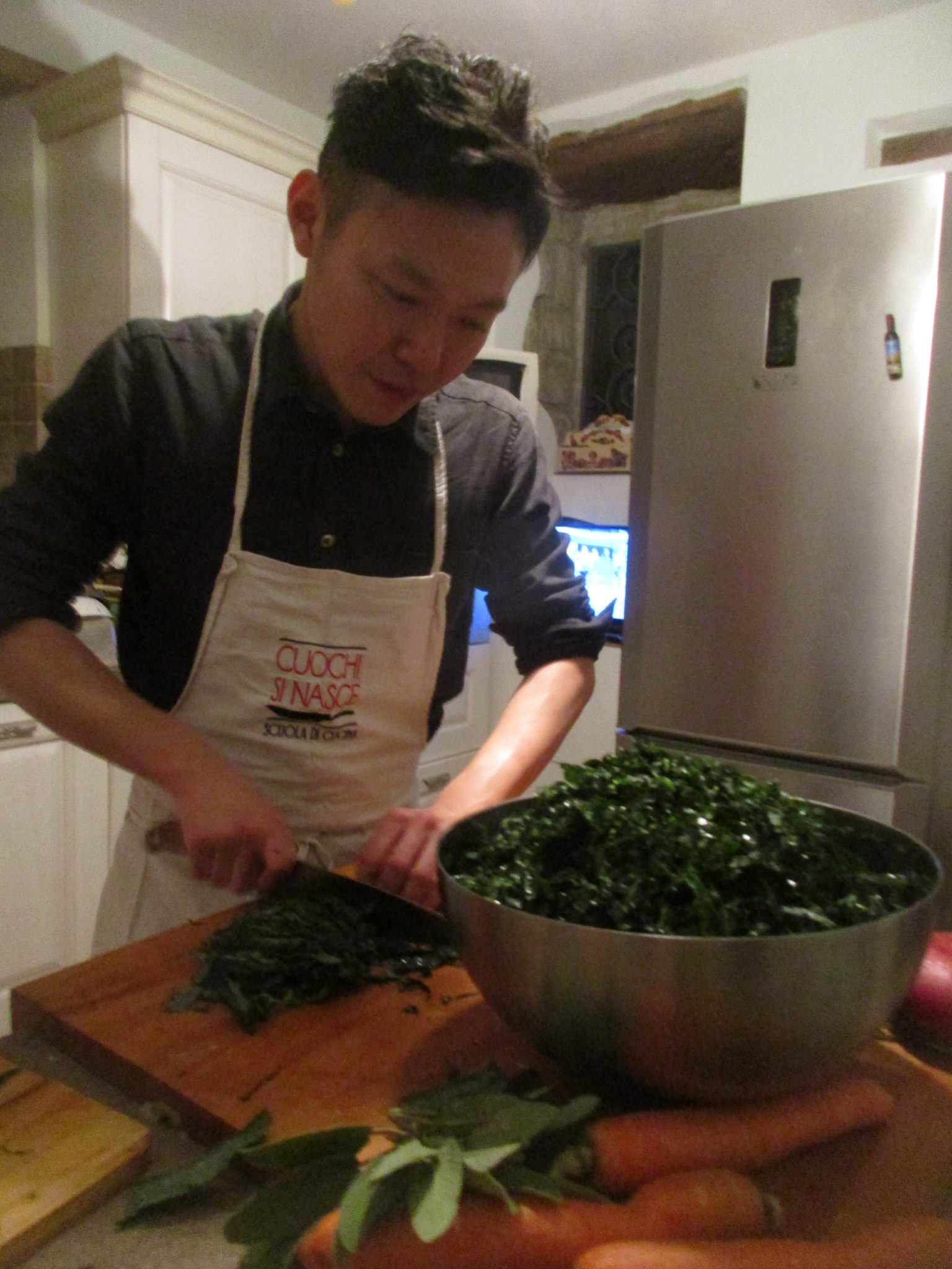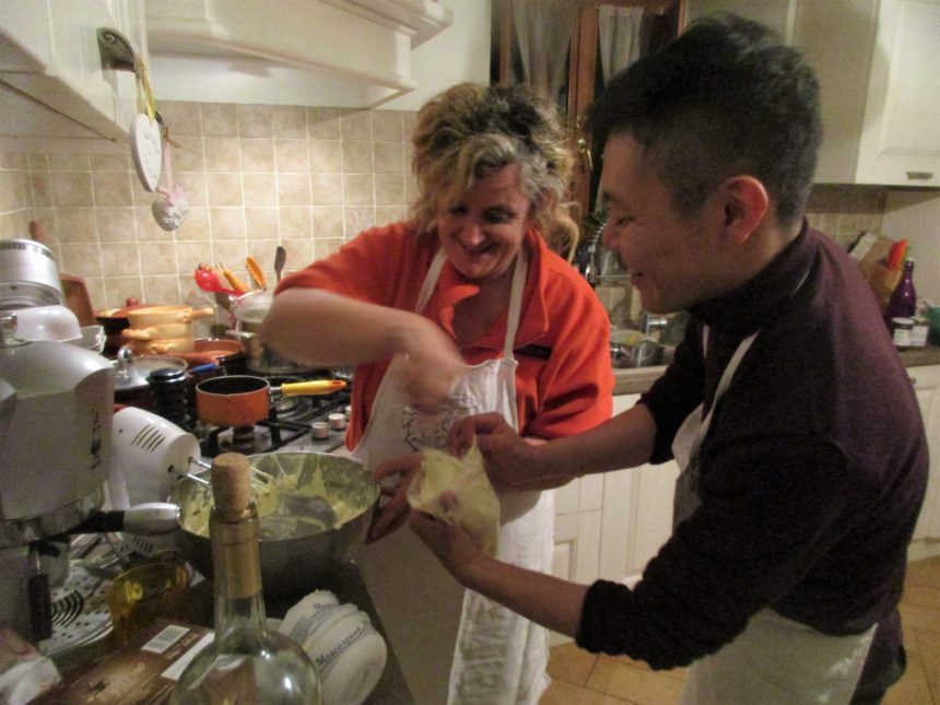 先週は2泊3日で、おらが村にあるシェフの方が来て下さいました。すでにシェフ歴は10年以上、今回、新しく大阪に新規でイタリアンレストランをオープンされるのですが、研修旅行の一部をコーディネイト&通訳をさせていただいています。料理教室でのご希望は、「普通のイタリアのお宅での日常の食事と、ハレの日の食事の2パターンがみたい」、それなら、数ある料理教室の中でもドンピシャはおらが村のダニエーラの料理教室。全2回、そして今回はスペシャルバージョンでいつもより2時間ほど多く時間を取り、ソース作りからほぼ全の行程を見て一緒に調理して頂きました。