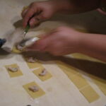 クリスマスバージョンのプリモは、やっぱり「トルテッリ―二・イン・ブロード」。まずはパスタ生地を打っていきます。マシンは使わず、麺棒で・・・こちらもシェフ、さすがの手つきでございます。