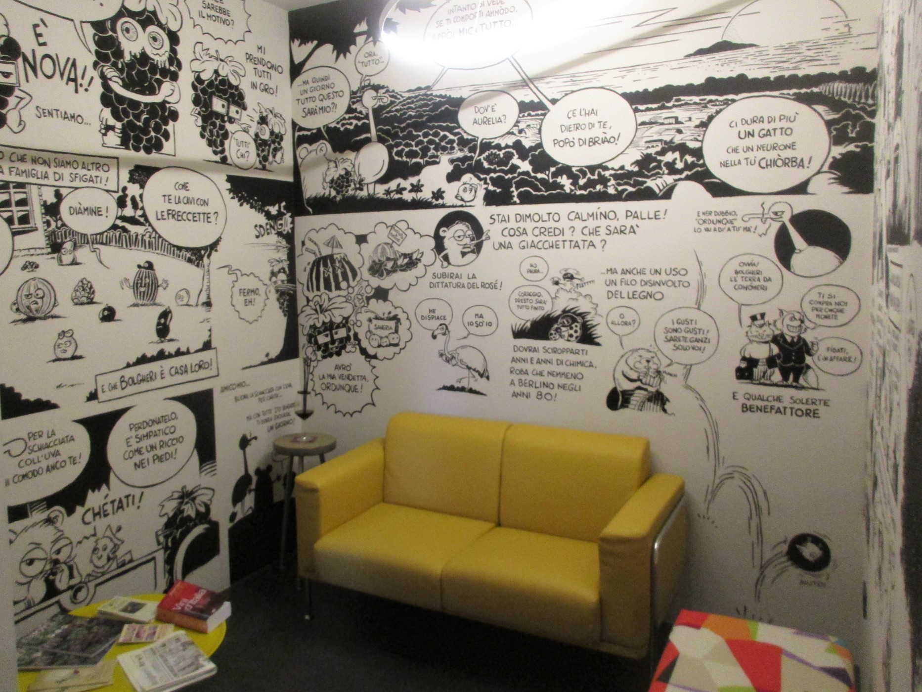 ブドウ畑にあるこの額はチンツィアさんのプロジェクトで、ワイナリーに1つ、ボルゲリの町に1つ、カスタニェート・カルドゥッチに1つの計5つが設置されています。壁画にも描かれた、イタリア人で初のノーベル文学賞を受賞したジョズエ・カルドゥッチが愛した、このゾーンの風景を愛しんで欲しいとの願いから。この地を愛し、そしてこの地が生むワインを愛してやまない、ワイナリーの情熱がひしひしと伝わってきます。