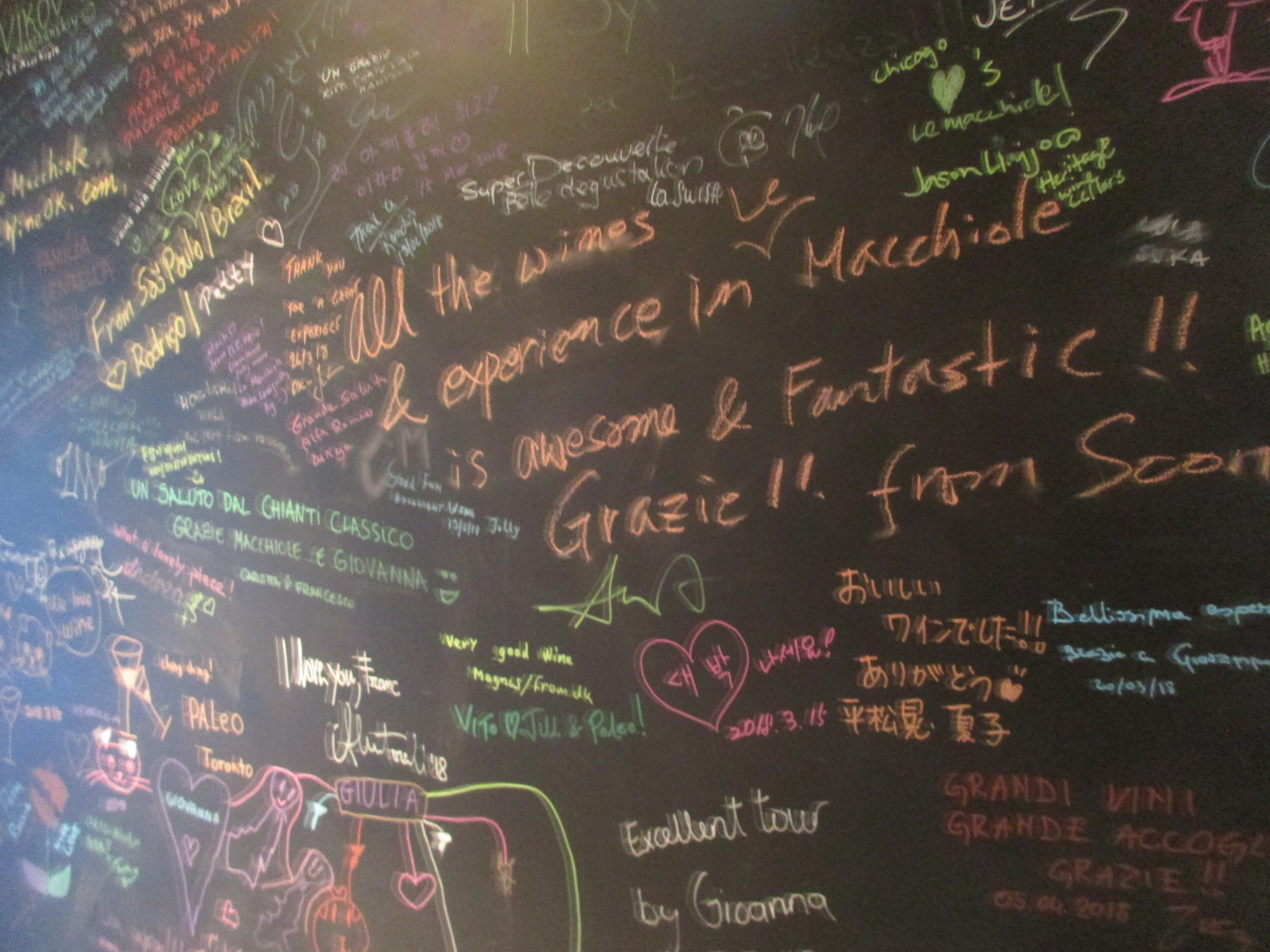 しかし、それまでの努力が結果を出し始めた2002年、エウジェニオさんは他界。残された奥様のチンツィアさんは、彼の意志を引き継ぎ、若い才能ある人を採用してワイナリーを牽引し続けています。事務所の側面に描かれたこ壁画は、近年チンツィアさんがアーティストに依頼して完成させたもの~トスカーナ、ボルゲリ、そしてこのワイナリーを表すいろんなアイテムが描かれています。ブドウのつる、ボルゲリの風景、そしてエウジェニオさんの愛車のチンクエチェント。一番大きく中央に描かれたのは、ドラクロワの名画「民衆を導く自由の女神」・・・これはボルゲリのワイナリー、このレ・マッキオーレが、フランス種のブドウを使って革命を起こすぞ、という皮肉も込めた、そして彼らの意気込みをひしひし感じる絵になっています。