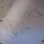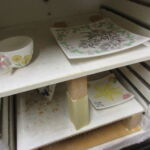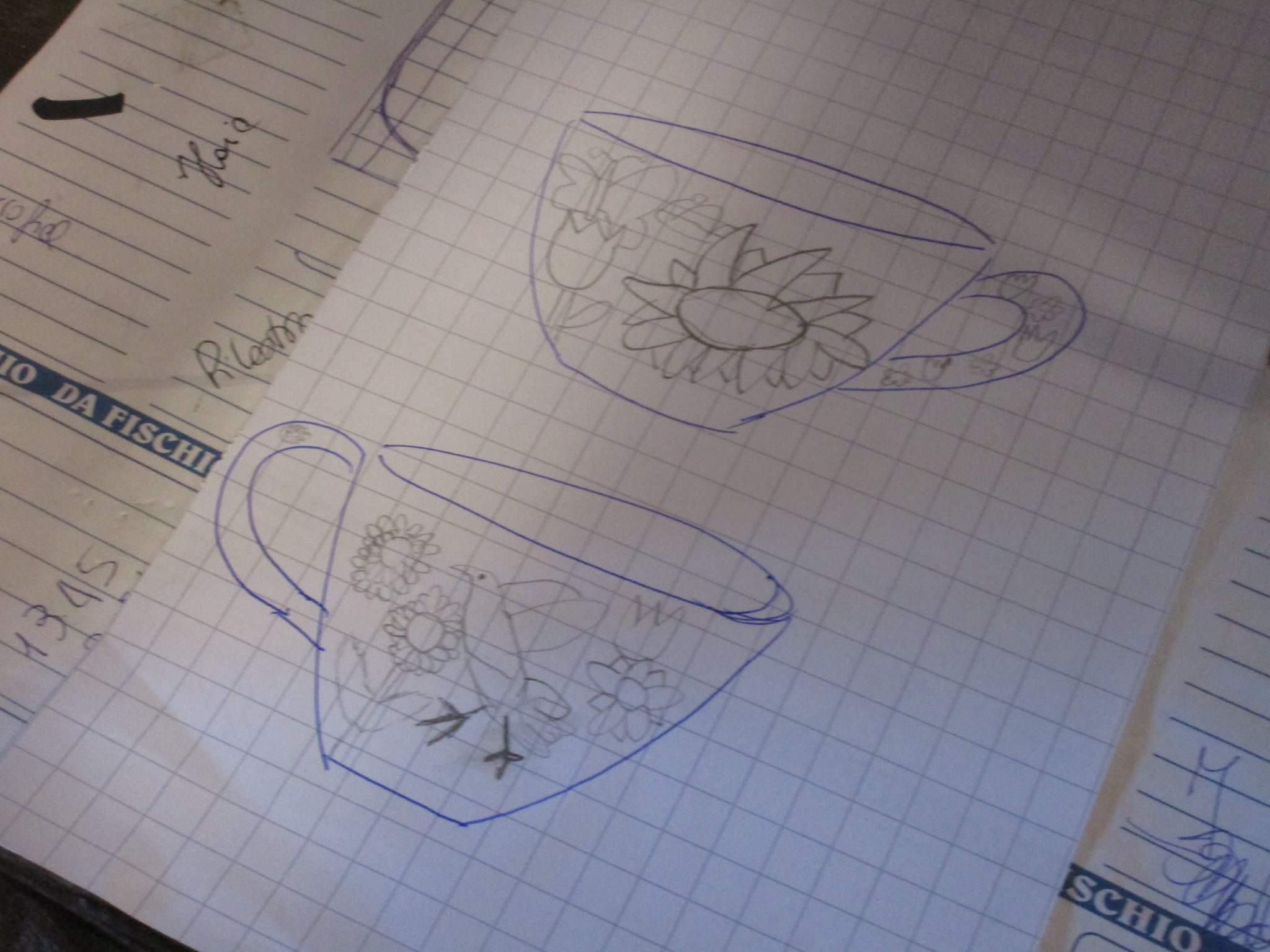 昼過ぎにフィレンツェから電車&最寄駅から休暇の家のカテリーナの車でおらが村へ。荷物はカテリーナに車で持って行ってもらって、私と絵付け工房で合流しました。絵付けはお母さま、娘さんの2人で、まずはベースを選んでいただきます。結果、妹さんはカップ、お姉さんは四角のお皿、お母様は一回り大きな四角のお皿をセレクト。工房の中のものからイスピレーションを受けて、それぞれ下絵を描いていきます。お母様が直接鉛筆で下絵を描いている時、娘さん2人は紙にアイディアを落とし込んでいきます。
