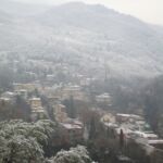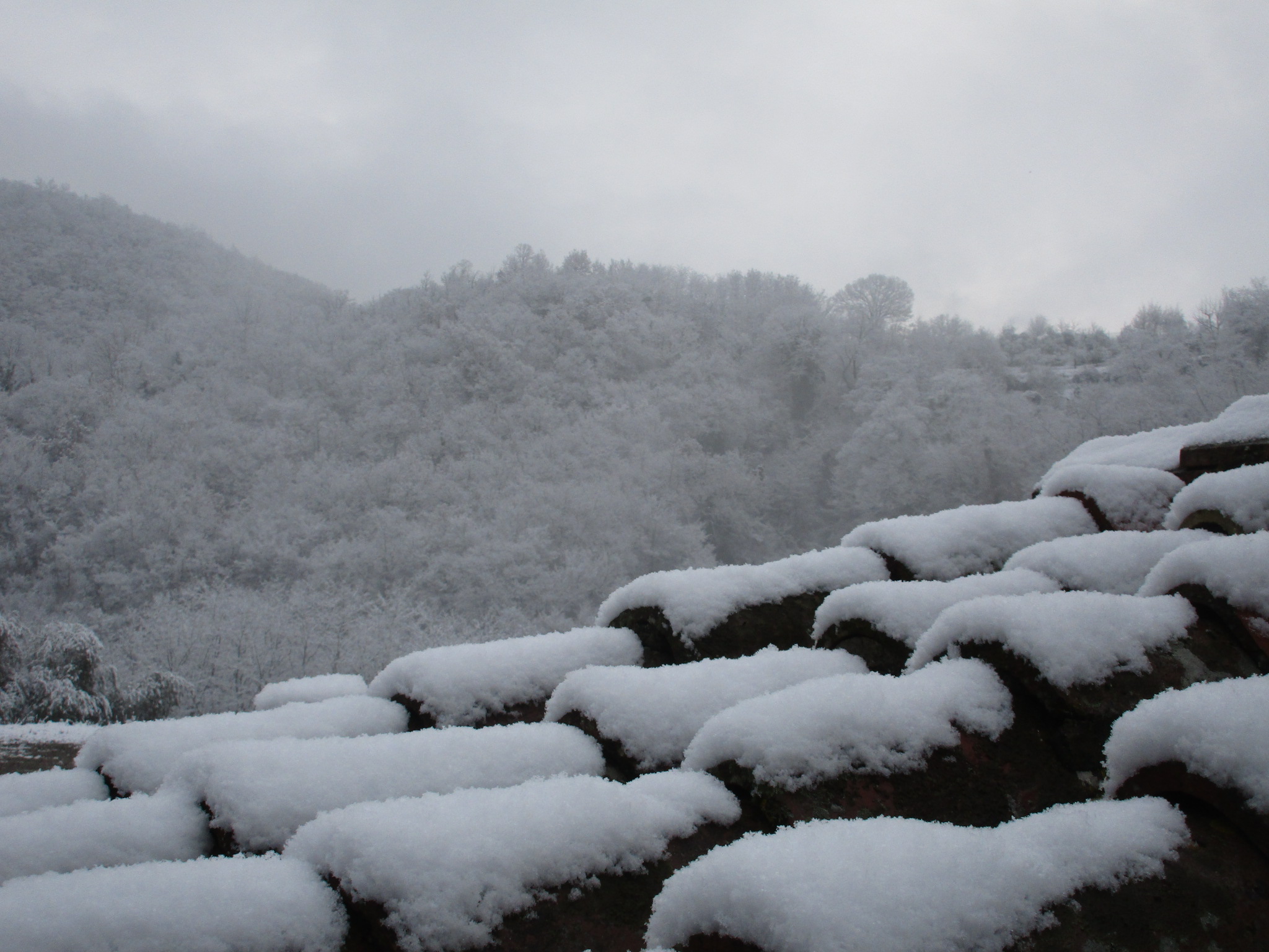 鹿との遭遇の興奮冷めやらぬまま、裏山頂上からおらが村を見下ろす。うわ~粉砂糖がかかったみたい!