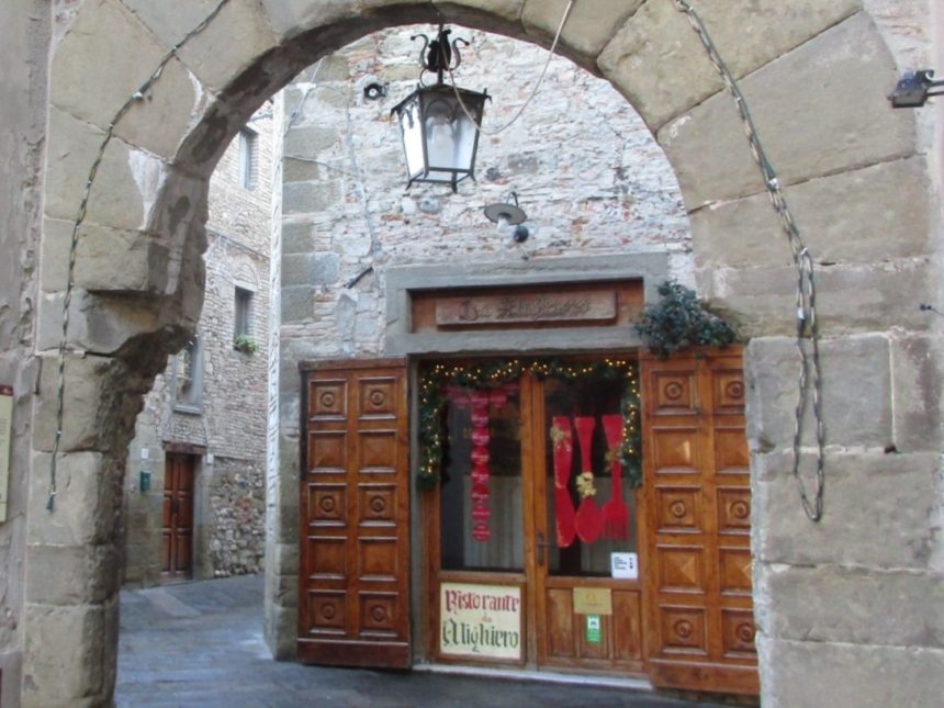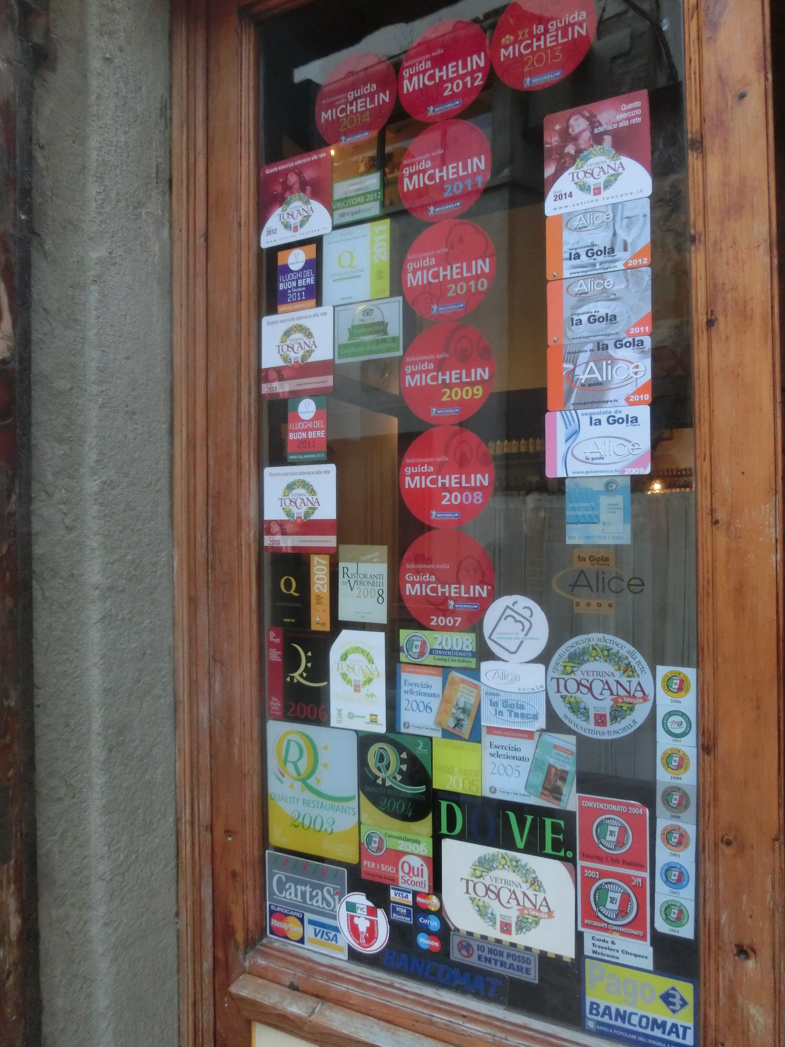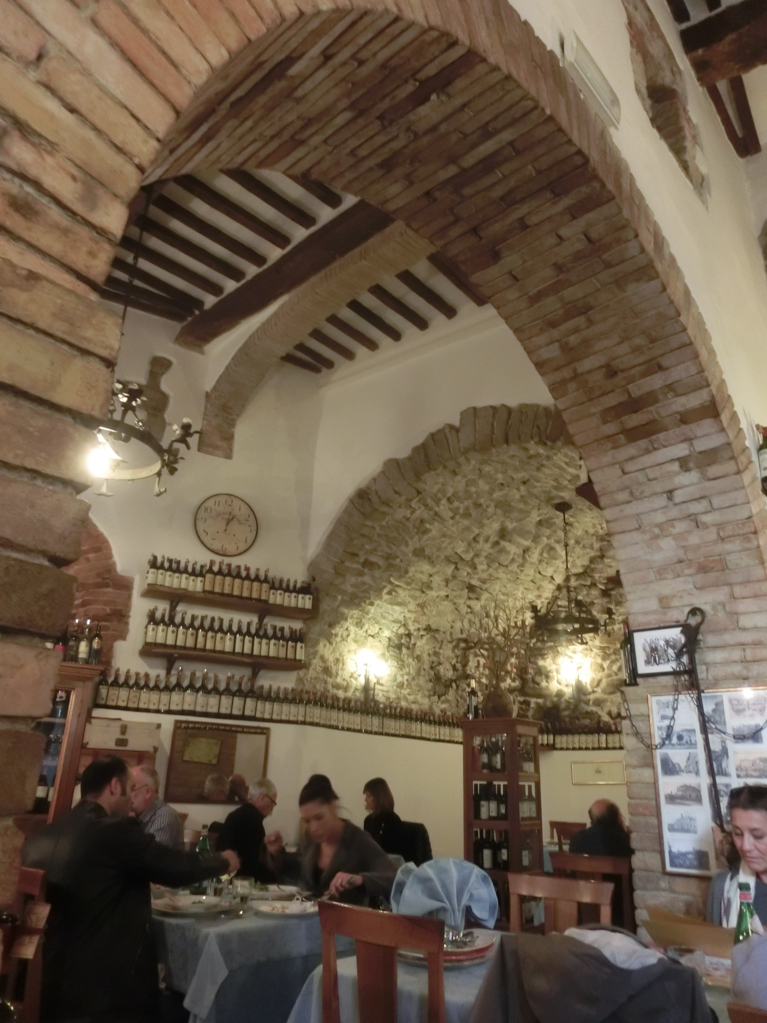 アンギアーリ旧市街、新門を入って正面のお店です。。入口のドアに貼られた数々のガイド本のシールが貼ってあり、ミシュランに何度も掲載されてる名店。しかし、入口に貼ってあるメニューもお値段も、店の雰囲気のわりにはそれほど高級ではありません。