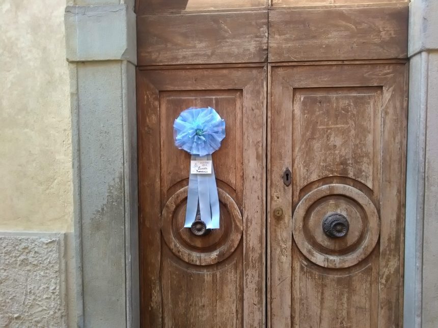 生まれた日から、だいたい、ですが、2週間くらい扉にかけて、赤ちゃんのお知らせを知らせます。フィレンツェの旧市街など、なかなか現地人が住んでいない場所では見かけませんが、フィレンツェでもアルノ川の向こう側とか旧市街でも端っこの方、そして観光地でない中規模の町や田舎町では、見る機会があるかもしれません。一般住宅でなくても、家族経営の小さなお店などは、お店にかけてあることも!そういうエリアや町に行かれる方、ちょっと気にして見てみて下さい~もしお家の方、お店の方を見かけて目があうことがあれば、「アウグーリ!(おめでとう!)」と一言、言ってみましょう♪