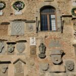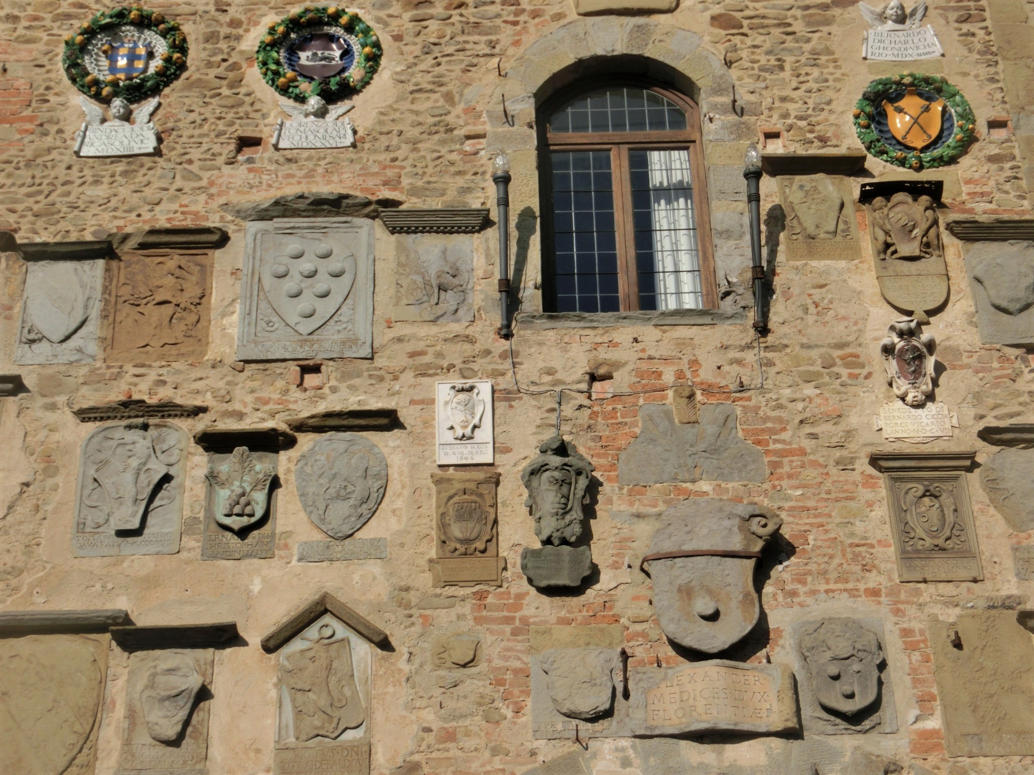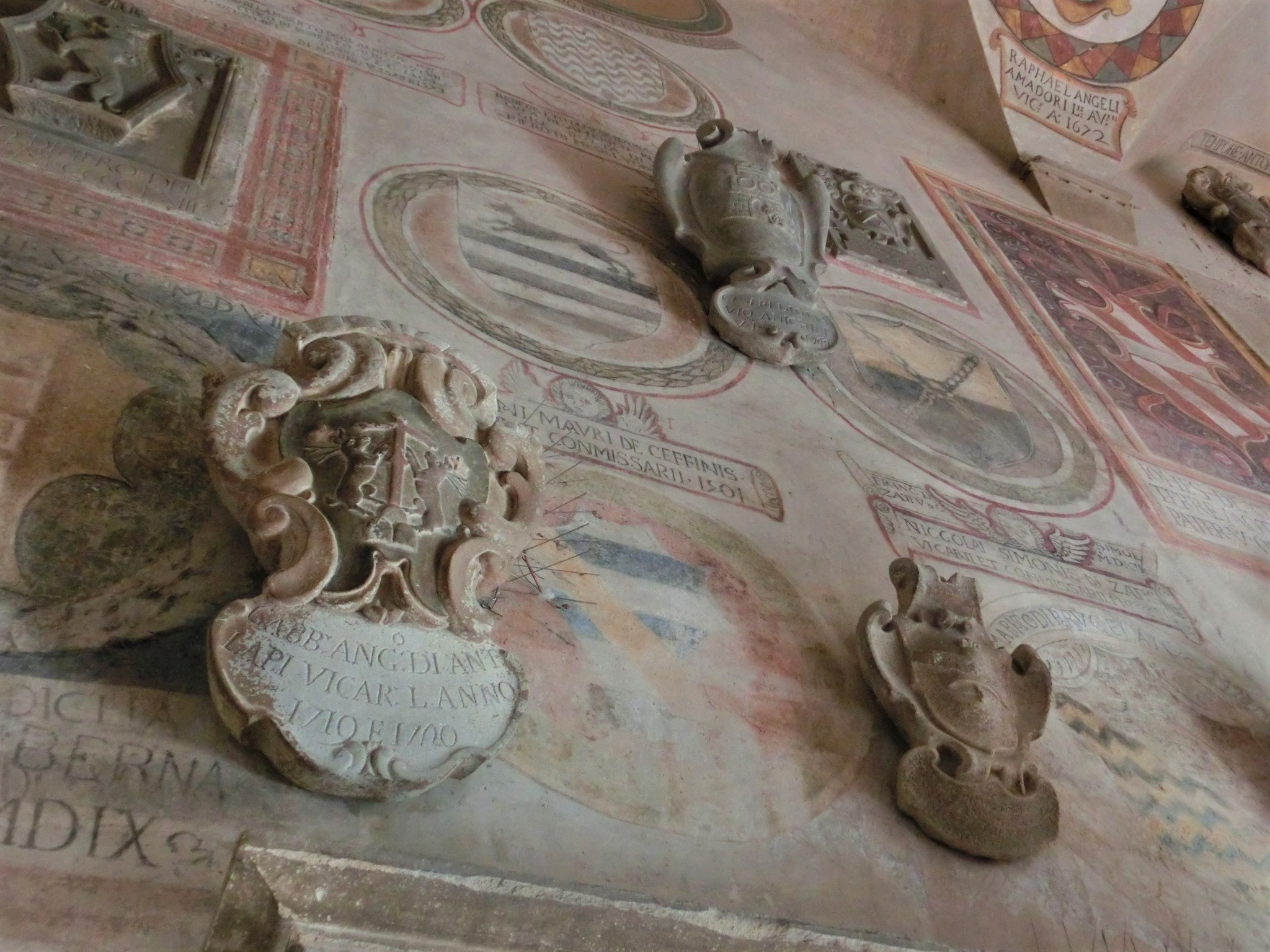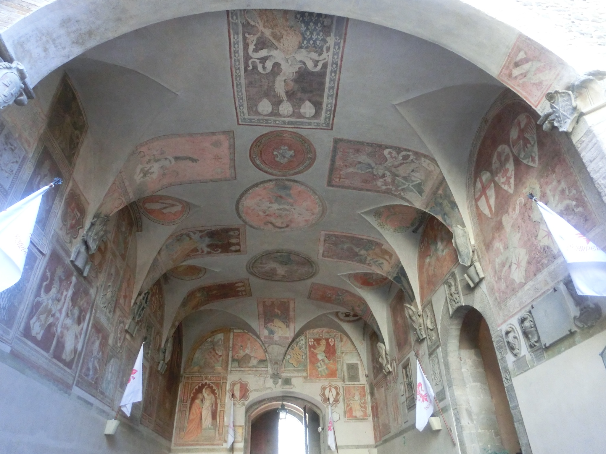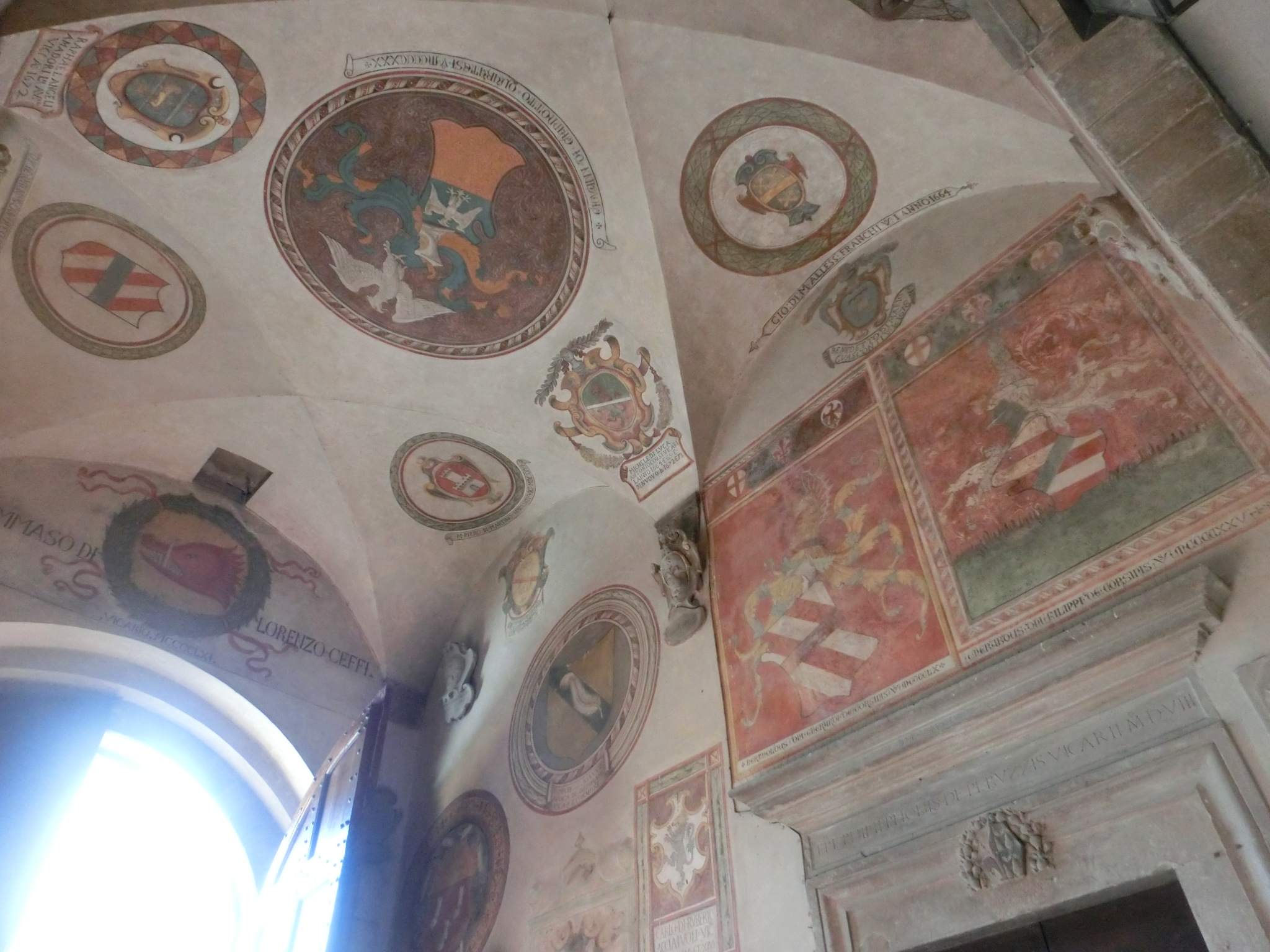 村は発展し、建設から1世紀も経たない間に、フィレンツェ共和国の代理人=ヴィカーリオが村を統治するようにになります。そのヴィカーリオさんの館であり、政治の場が今も村の中心にそびえるヴィカーリ宮殿。宮殿の正面、そして、エントランスの内壁、そして部屋の中にも、歴代ヴィカーリオを務めた人の家紋が記されています。つい20年ほど前まで市庁舎として使用されていましたが、現在宮殿は博物館(宮殿博物館とナイフ博物館が併設)になっています~このエントランスは、開いていれば誰でも入れますので、ぜひ!