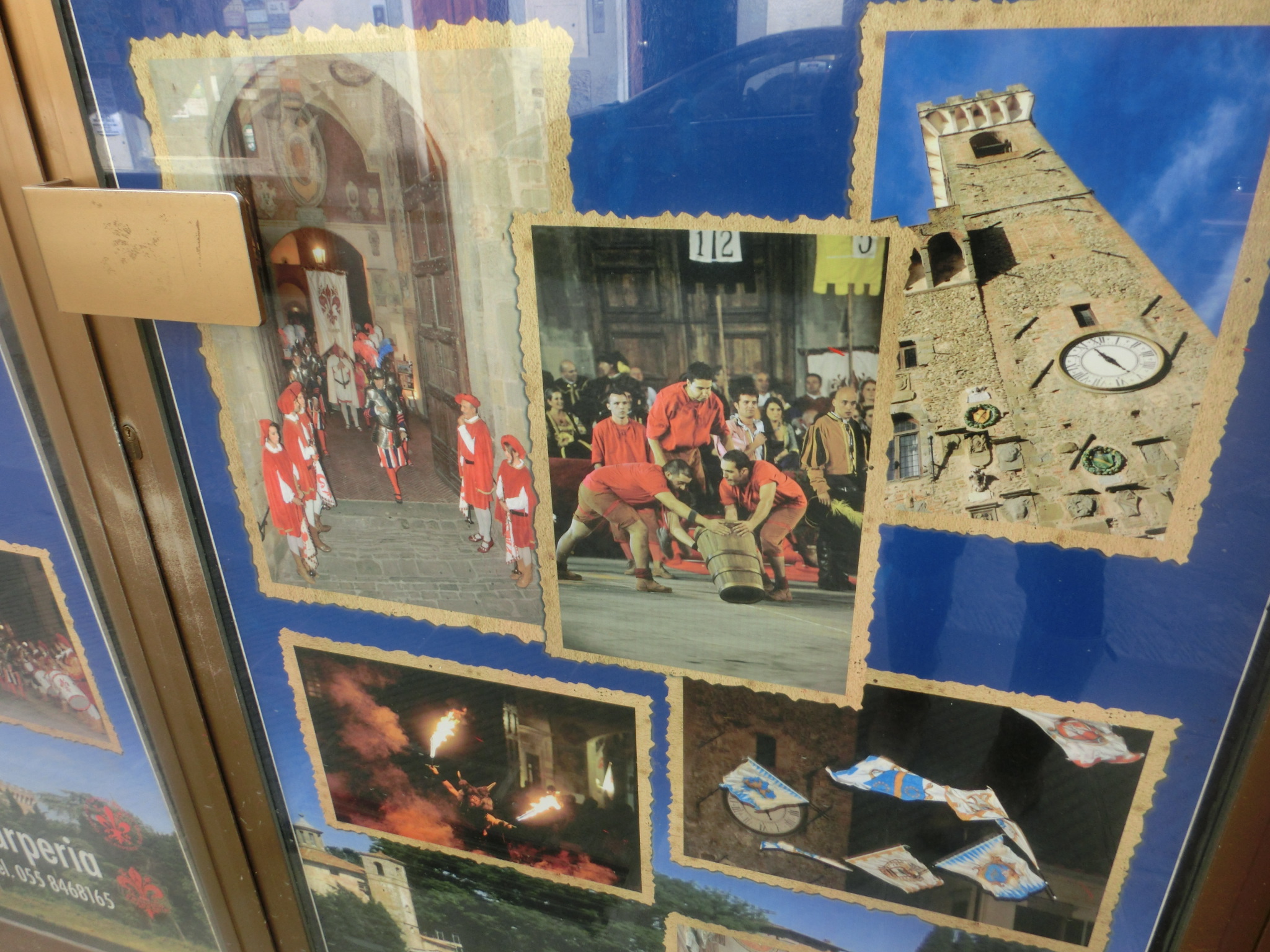 そして最後に、村最大のお祭りについて。1306年9月7日にフィレンツェ共和国により建設されたお祝いの日、つまり建村記念日となるのが翌日の9月8日、この日に「ディオット」というお祭りが1931年から行われています。村全体がお祭りムードに包まれますが、メインイベントは夜、地区対抗レース・パリオ。パリオはシエナの馬レースが有名ですが、ここのレースは各種中世のレースを組み合わせたものなんです。以前見に行ってチケットが手に入らなかったので、今回ツーリストインフォメーションの方に聞いてみましたが、高い席(20ユーロ)は村の実行委員会事務所にて前売り、安い席(10ユーロ)は当日の18時頃からヴィカーリ広場の角にあるスタンドにて購入だそう。私たちはまさにこのスタンドに買いに行ったのですが、すでに売り切れ!オープン前に並んでおかないと、すぐに売り切れるそうです。