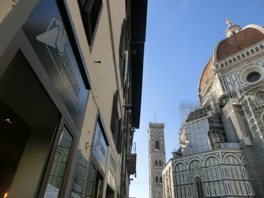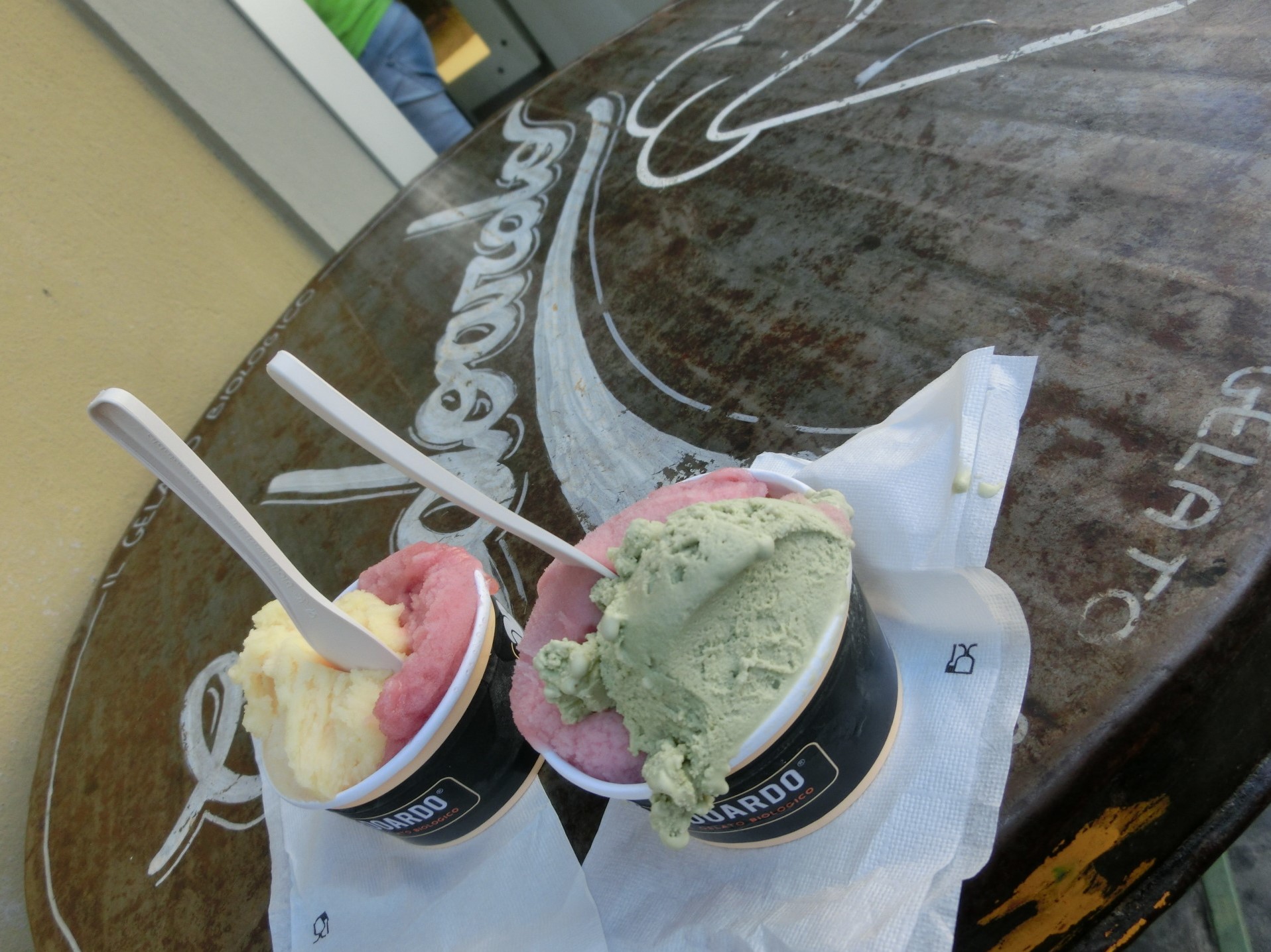 こんな絶景の前で、極上ジェラートを味わっちゃいましょう!この日のフレーバーは、まさにクーポラの設計者である「ブルネッレスキ」の名前がついたホワイトチョコレート&ラズベリー、はちみつ&ラベンダー。ブルネッレスキは下手したら甘すぎてしつこそうなコンビが上品に仕上がっていくらでも食べられそう!そして、ラベンダーは口に入れたらホントにむわっとラベンダーの香りが広がる初めての体験!迷った黒ゴマは次回のお楽しみ、前回食べたキアンティ=赤ワインのシャーベットも捨てがたい・・・いろいろ食べたいフレーバーが多くて迷ってしまいます。