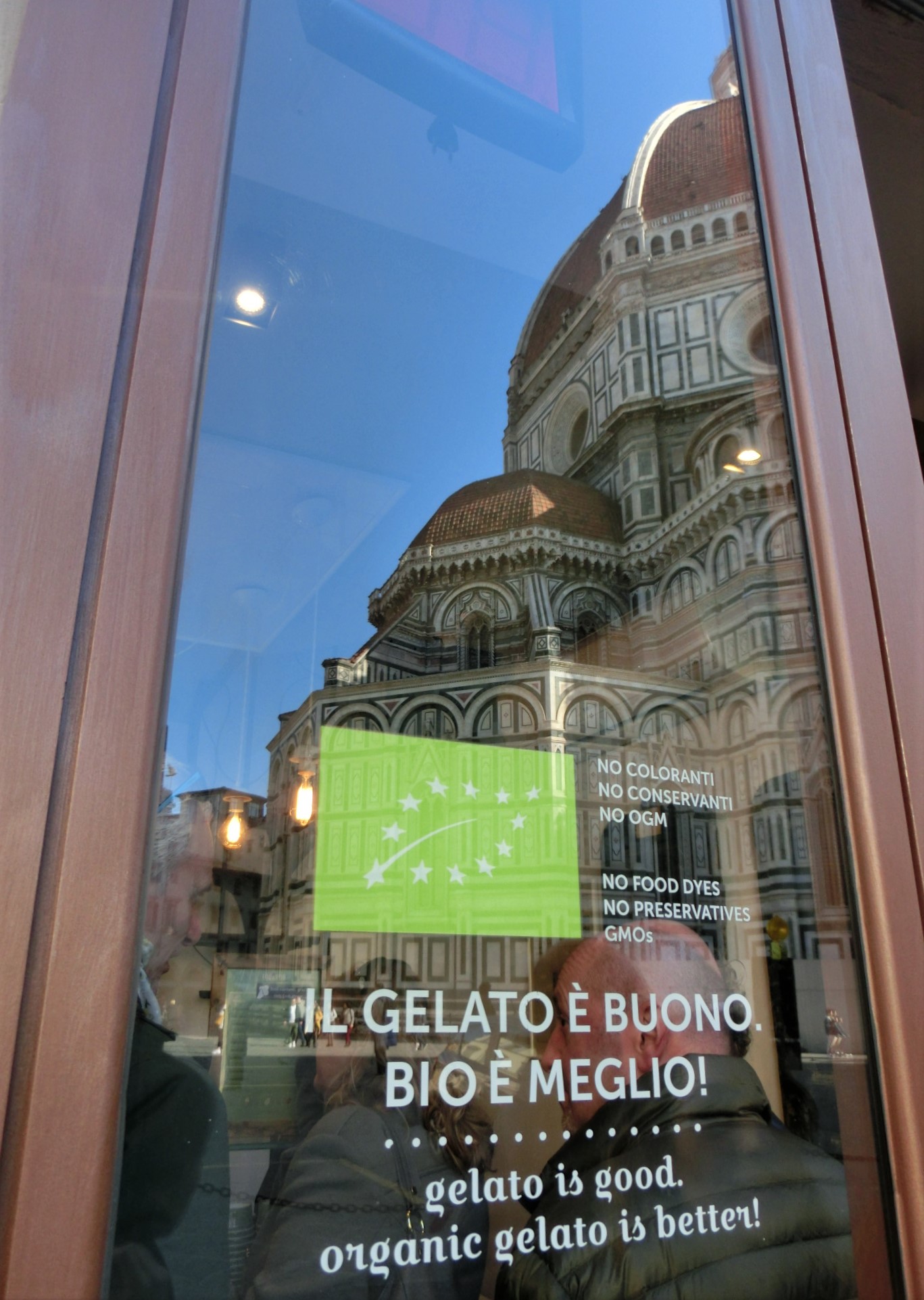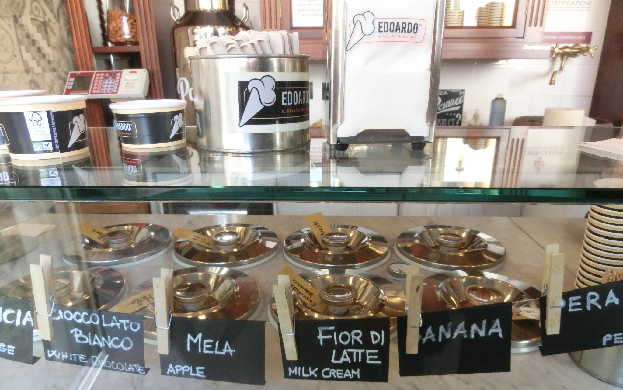 数多くあるフィレンツェのジェラート屋さん、バールなどの仕入れジェラートを除いた「自家製ジェラート」屋さんだけでも、老舗、チェーン店などなど、本当にたくさんあります。その中で比較的新しいのに、一躍有名&現在でも大人気のジェラート屋さんが、こちらエドアルド。今ではよく見かける「オーガニック」のジェラートですが、ここはトスカーナで初めての認証付きのオーガニックジェラート屋さん。添加物、着色料、保存料、乳化剤が入ってないのはもちろん、原材料の生産においても化学肥料、農薬を一切使用していないものばかり。つまり、牛乳を提供する牛や、卵を提供する鶏も、自然の牧草や有機の飼料を食べて育ったもの、という徹底ぶりなんです。
