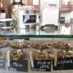そんな風に作られたフレーバーは15種類前後、決して多い方ではありませんが、スタンダードなフレーバーからオリジナリティあふれるものまで様々。お店の外にその日のジェラートが張り出されているので、お店に入る前、また並んでいる時に選んでみて下さい。お店には2つ入口がありますが、入るのは右、そこからレジでコーンかカップ、そして大きさを選んでお金を払い、フレーバーを選びます。