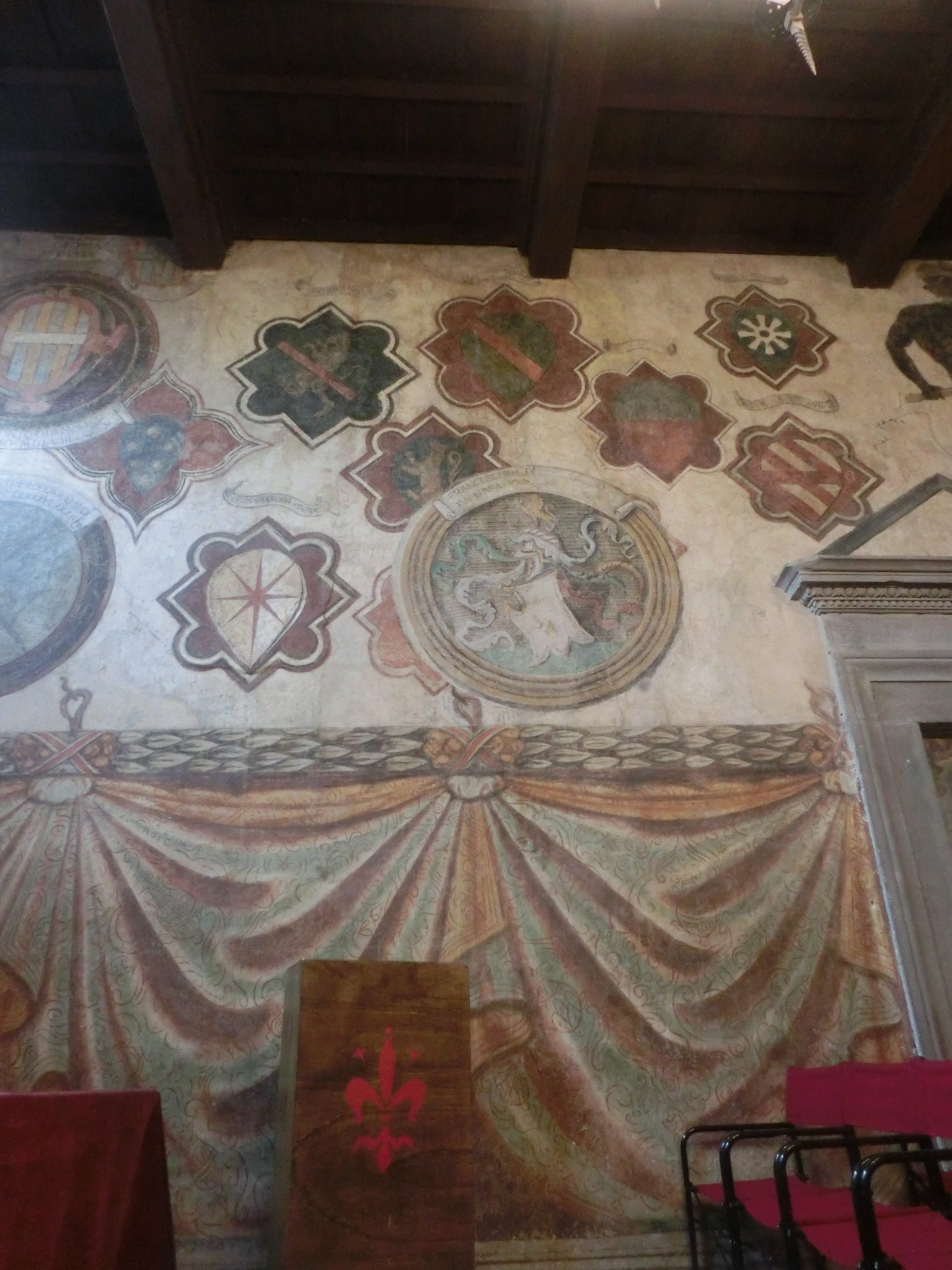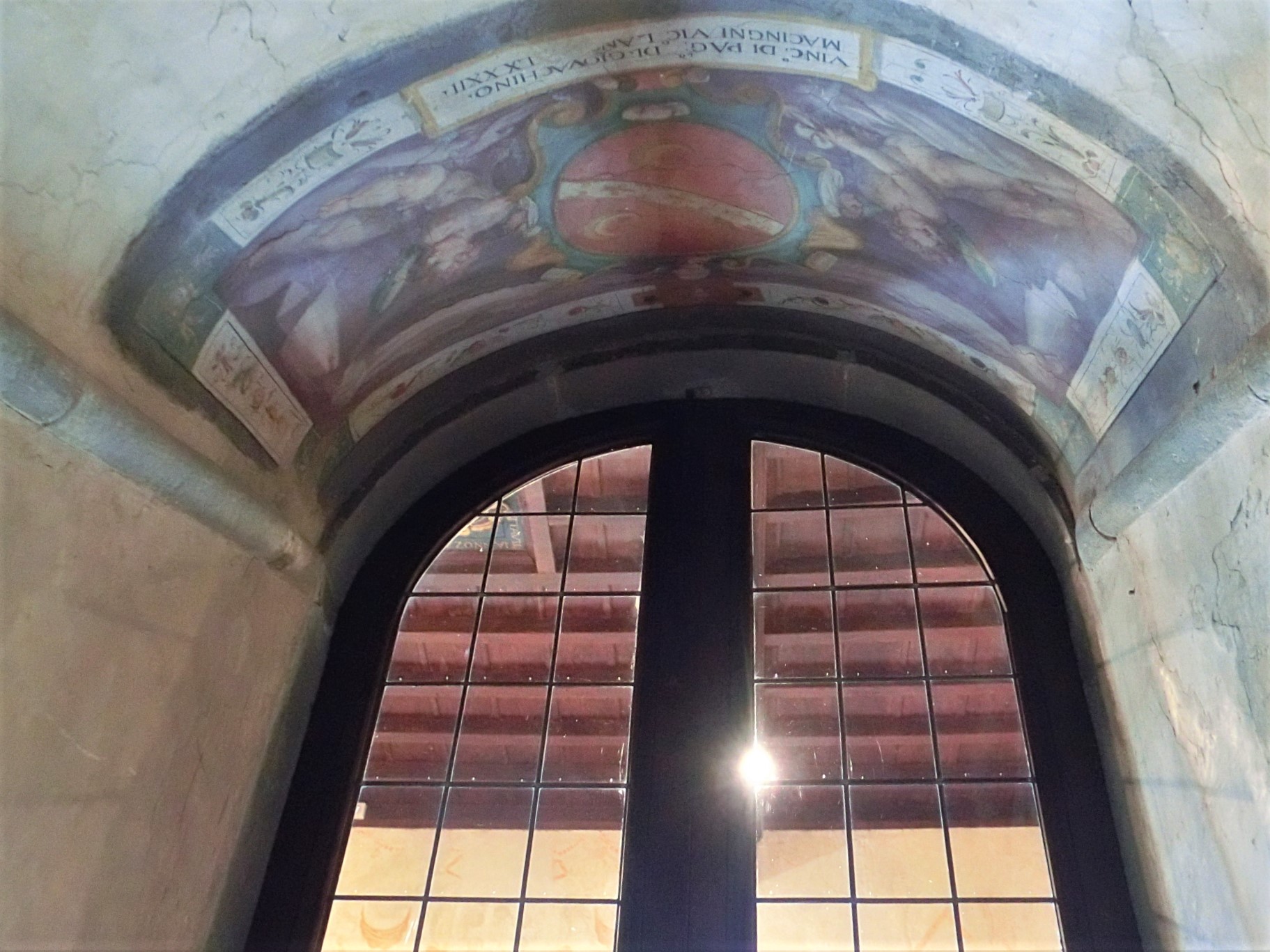この部屋は名前の通り、かつてより評議会が開かれていた所。別名「カーテンの間」、と呼ばれるように、壁面にはヒダがリアルなカーテン、その上には歴代ヴィカーリの紋章=任命されたヴィカーリは、その証拠として必ず紋章を残さなければならなかったので、過去の紋章の上からかぶって描かれているのが面白いです。そしてアイアンの照明器具や大きな暖炉・・・この空間に身を置くだけで、中世にタイムスリップしたかのよう。