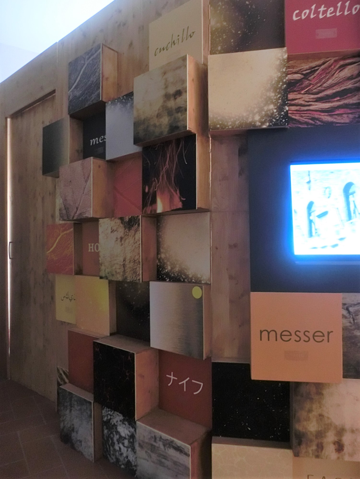 宮殿の間とはうって変わって、近代的なパネルを見ながら最初の部屋へ。この通路と最初のマルチメディアルームは、2014年にオープンしたもの。ナイフ工房での製作過程のビデオや、世界各国語で書かれた「ナイフ」、いろんな資料などがあり、学校の遠足やワークショップなどで使用されているそうです。