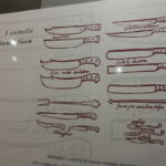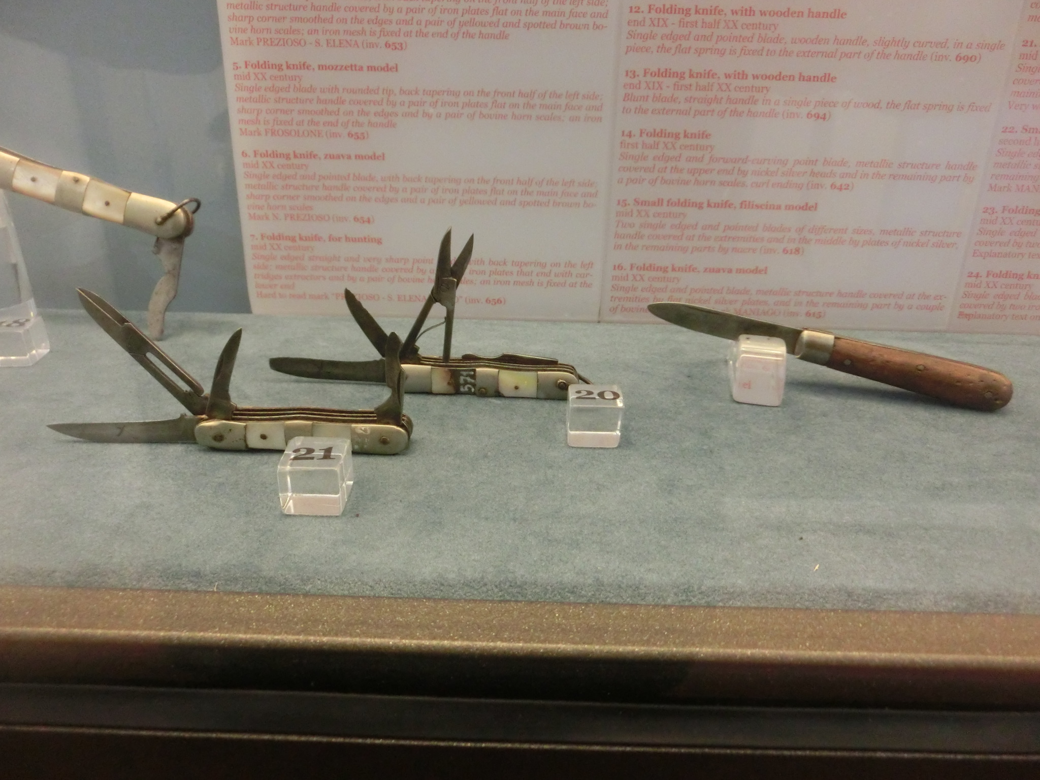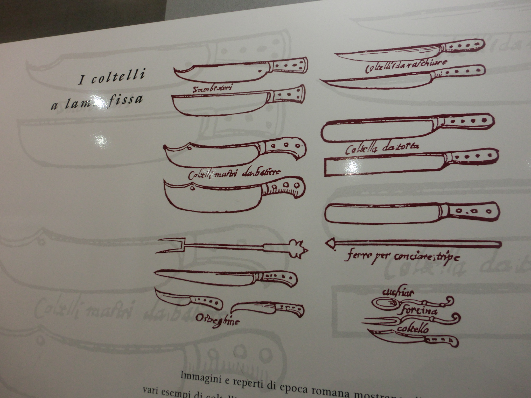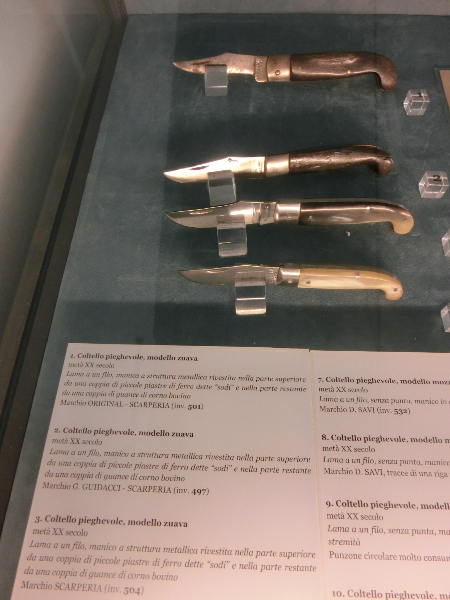 そしてイタリアのナイフ生産者について。1800年代、北部のピエモンテ州、ロンバルディア州、フリウリ、中部ではこのトスカーナ州のスカルペリア、南部ではカラブリア州の一定の地域でナイフ生産が盛んになりました。このパネル、生産地ごとにその特徴的なナイフが描かれていて楽しい。