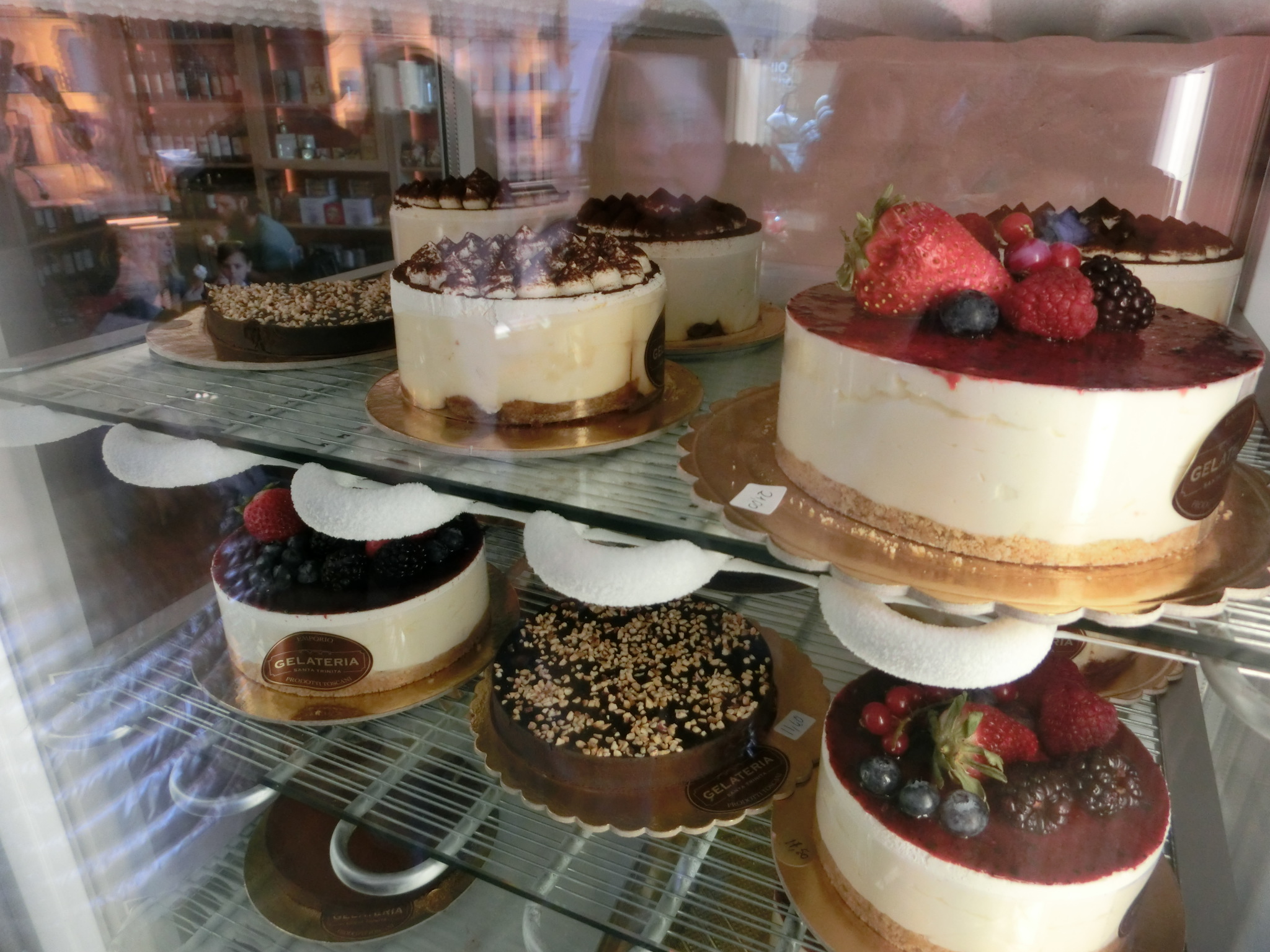 ジェラートだけでなく、1ポーションのティラミスやムースなどがあるのも嬉しいところ。大きいサイズのムースケーキ、ジェラートケーキなどは、ジェラートカウンターでなく店内別の冷蔵庫にあるので、アパート滞在の方なんかは、お持ち帰りして夕食後のデザートにもいいですね。