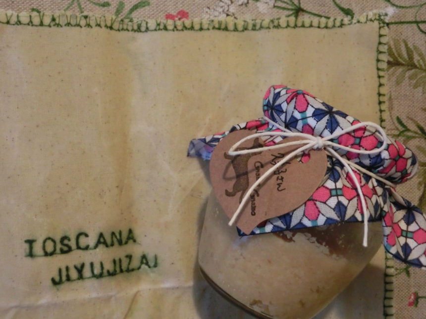 TOPの写真は、先日ローカルバスを乗り継いで行った田舎住まい日本人友とのランチで、Sawakina ちゃんからもらったもの。いつもいろんな手作りの手土産を持ってきてくれて、今回はやっとお返しができる~っ!とやっとできた自家製オリーブ塩水漬けを持って行ったのに、今回もそれを上回る素敵なお土産をプレゼントしてくれました。右は、酢味噌!そして左に敷いてあるのが、蜜蝋ラップ~しかもTOSCANA JIYUJIZAIの刺しゅう入り!