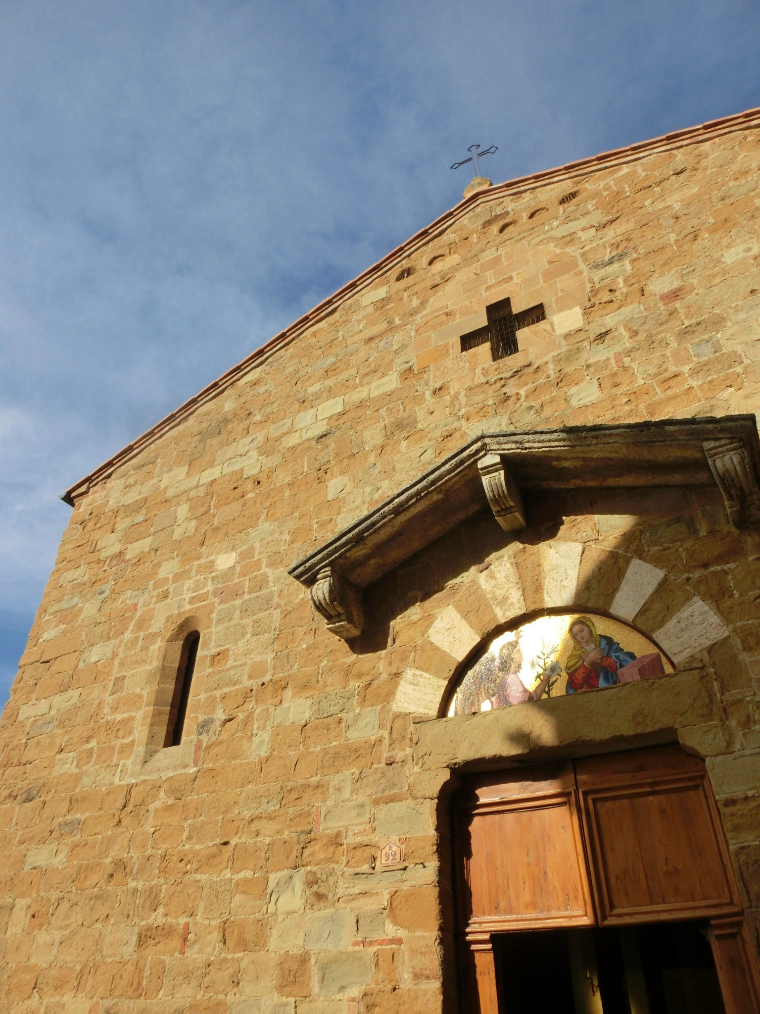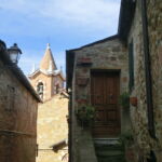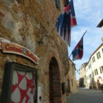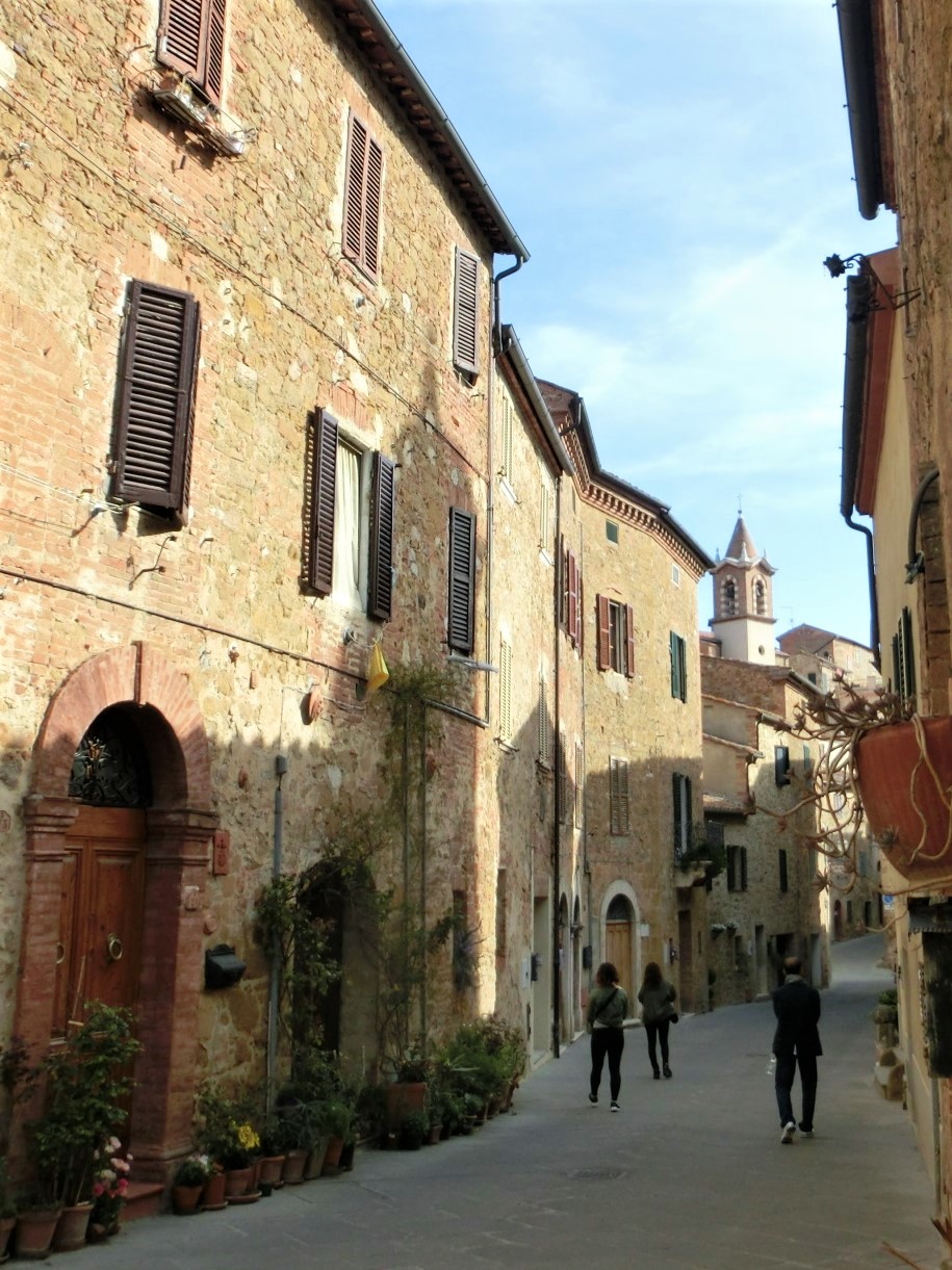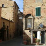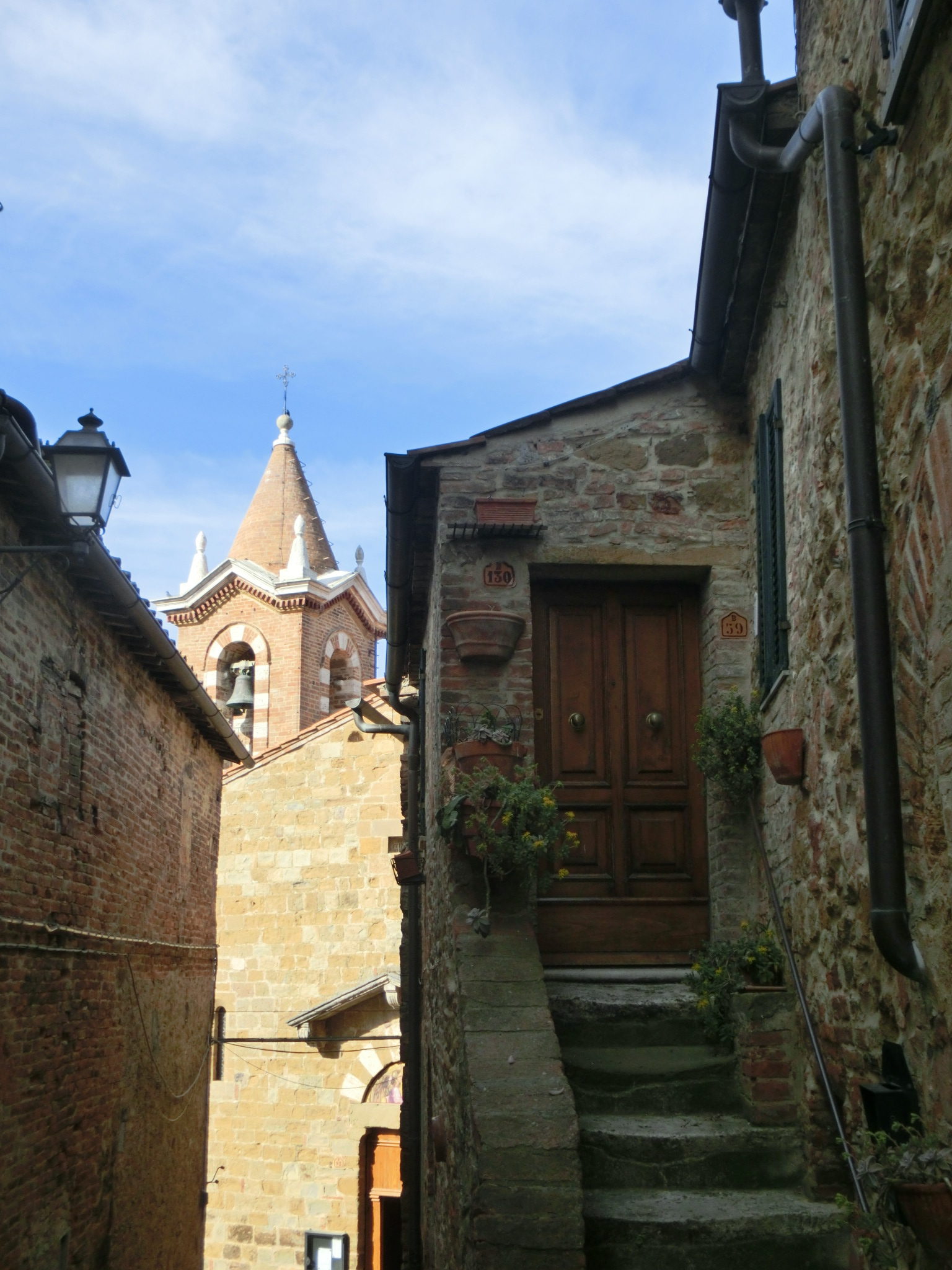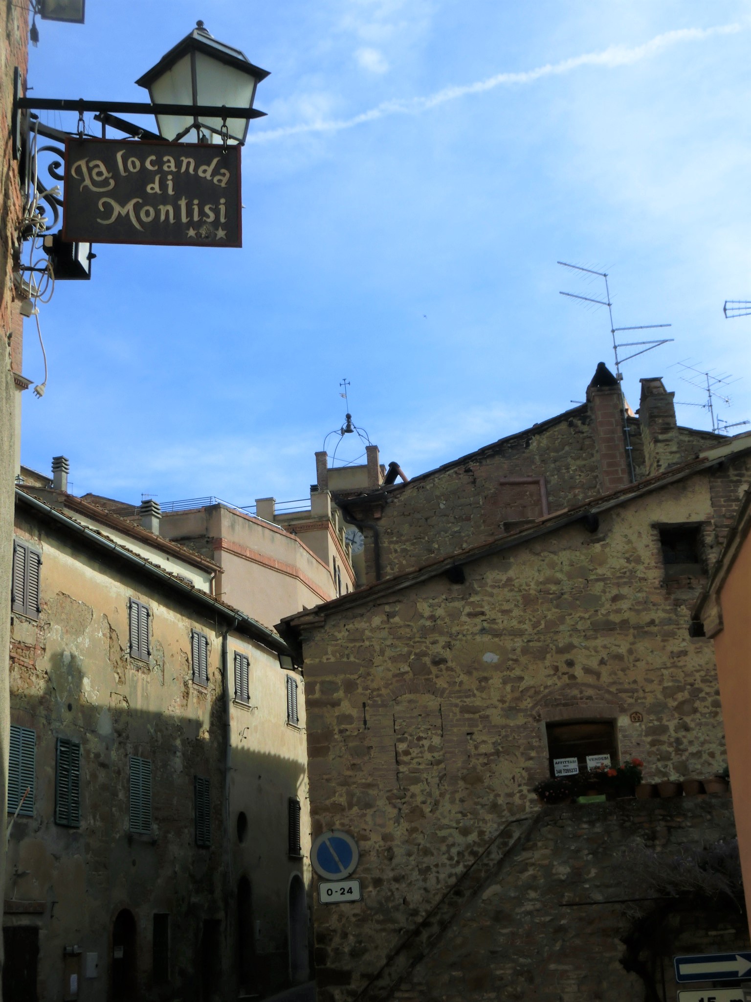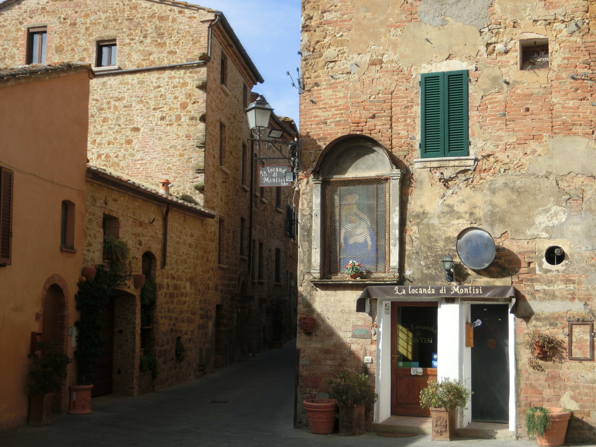 ピエンツァから北に向かう道は、ちょっと山深くて景色もあまり見えないのだけど、しばらくすると丘の上にこんな風にモンティ―ジが見えてきます。村の起源はエトルリア時代に遡り、名前は2キロほど先にあるイシス神にささげられた教会にちなんで=Monte Iside(イシス神の山)、からつけられたとされています。特に城塞や門があるわけでもなく、さらっと村の中に入ってしまい、たぶんこの辺が中心かな、と思われる場所で車を下車。観光案内所もなく地図もスマホのグーグル以外ないけれど、迷う心配のない小ささ&時間も余裕があったので、気ままに散策を開始しました。