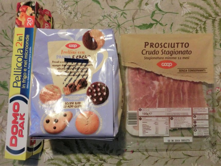 イタリアではビスケットが朝食にすることも多く(それをカッフェラッテにつけながら食べる)、スーパーにも朝食用のビスケットがたくさん売っています。そのビスケットの包装、メーカーによってはこのように開封後に閉じるためのシールがついているんですが・・・便利そうでしょ?まぁ1回目くらいは便利なのですが、数回開封すると粘着力が落ちてくる&粉がついたりして、押さえてしっかり粘着させても徐々にはがれてくる・・・イラッ(苦笑)。シールが使えなくて結局ゴムで止めるなら、このシールやめて1セントでも安くして欲しい。