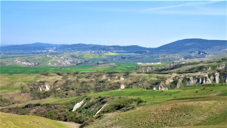 Crete Senesi(クレーテ・セネージ)とは、直訳すると「シエナの粘土」。シエナの南~オルチャ渓谷の北までの、アシャーノ、ラポラーノ・テルメ、モンテㇿ―二・ダルビア、サン・ジョヴァンニ・ダッソ(モンティ―ジはモンタルチーノ市の管轄になる前はここの分離集落でした)、ブォンコンヴェントのエリアを指す地域名です。この地域の土に含まれる粘土質から呼ばれる名前で、専門的にはマッタイオ―ネと言う岩塩と石灰が混ざったもの。草が刈り取られた時は、その土の独特の色、月の表面のようなブルーグレーが顔を出し、