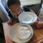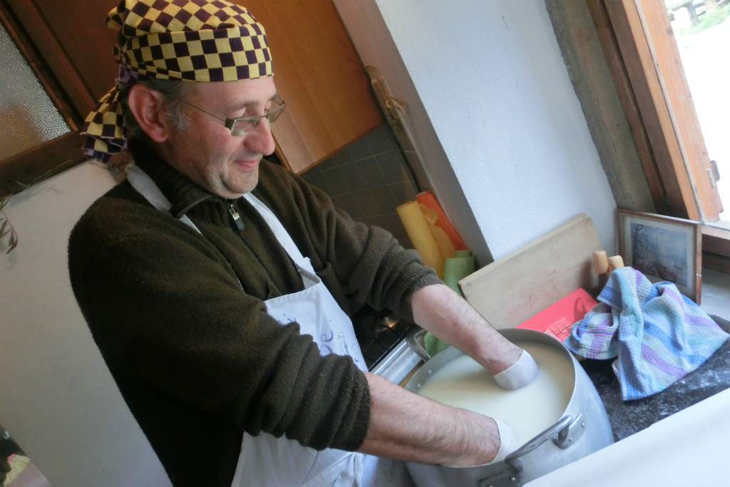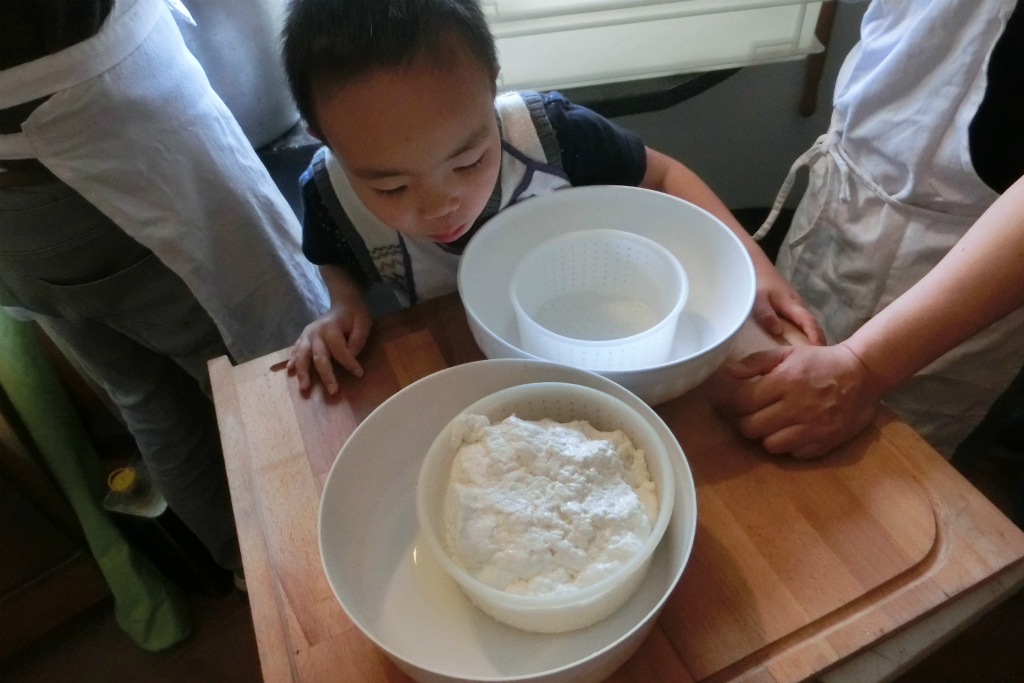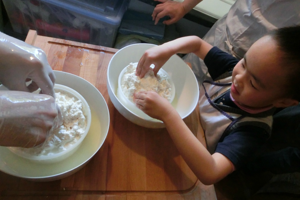 たってのご希望は、チーズ作り体験。これができるのはここだけ、しかも期間限定です。固まったお乳を型の中で崩していくのですが、指つんつん、が可愛い♪