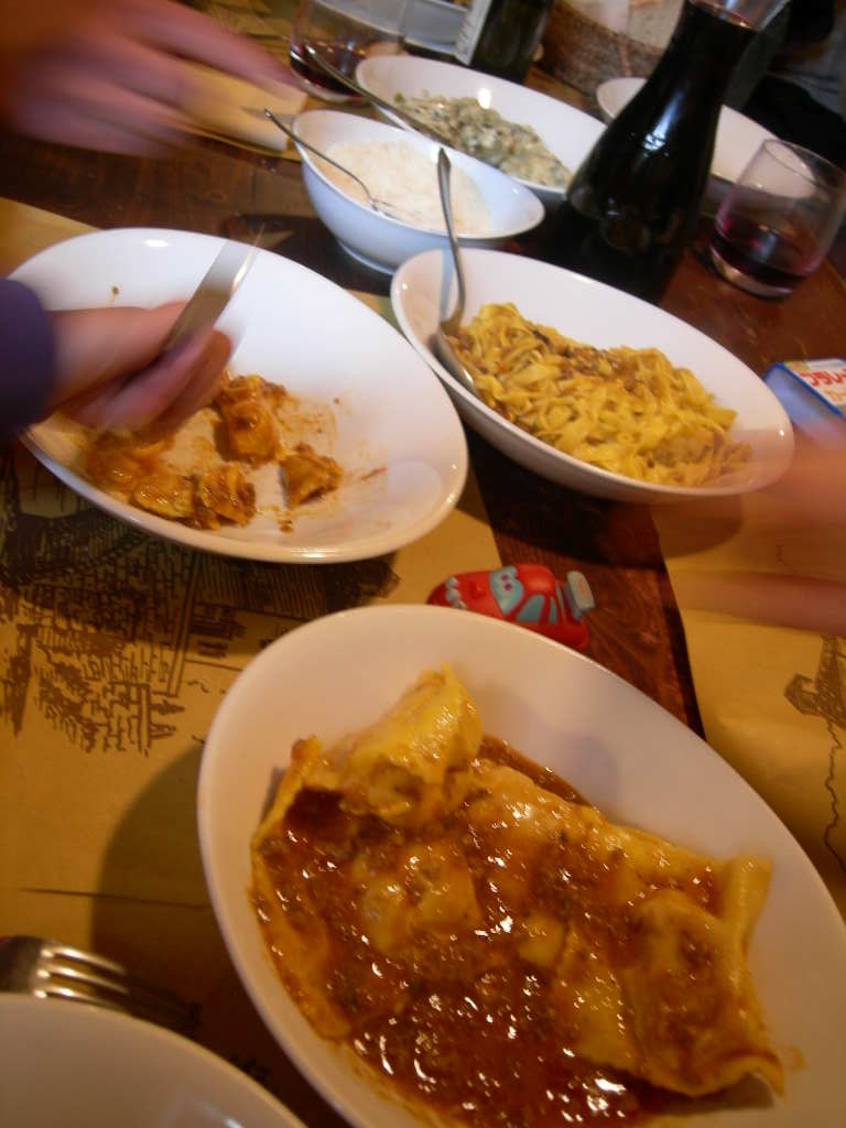 こちらがある日の注文の品。これで私達(大人2人+2才の息子)は満腹!&これで 20ユーロ以下! テイクアウトをすれば、プラスチックのお皿・ナイフ&フォーク・紙ナプキンをくれて、外にあるスペースで食べる事もできます。そしてそこから階段を少し上った所に、また別のオープンスペースがあり、塀で囲まれているので子供連れも安心して食事ができます。