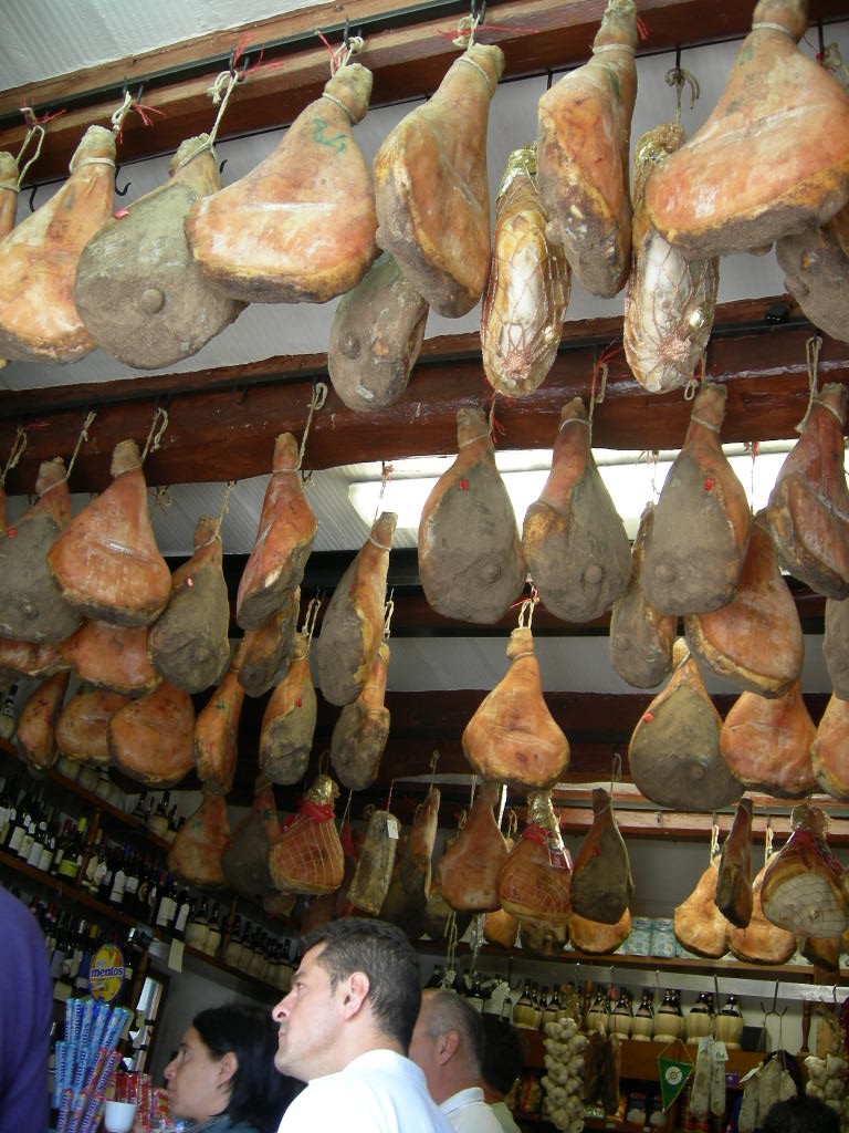 お店の名前の意味はズバリ、 ハムの館 。小さな入り口を入ったら、天井から吊るされた生ハム達が圧巻!この写真だけで、生ハム好きの方はもうノックアウトでしょう~。そして、この狭いスペースにはぎ~っしりと美味しそうなものがいっぱい!ショーケースには サラミやチーズ各種 、外にも ポルチーニや栗などの旬の食材、カウンター奥にはワインもたくさん並び、棚にはお土産にもよさそうなソースなどの瓶詰めの商品もあります。