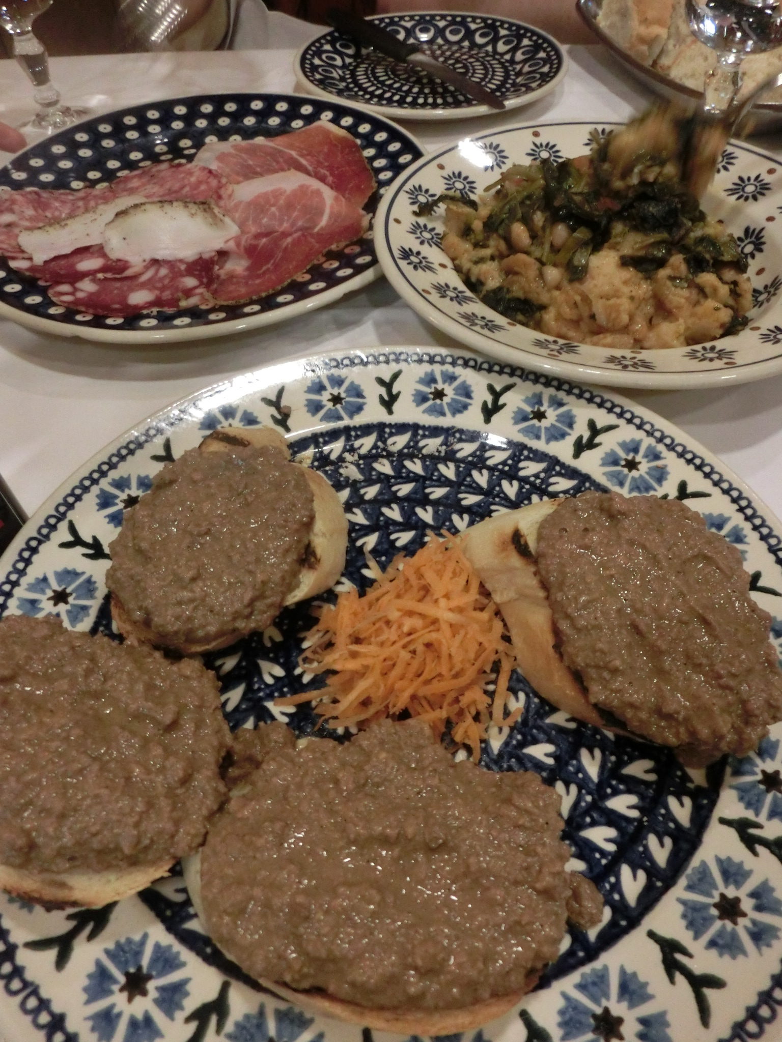 この日は70才前後のご婦人3人のアテンドで。あまり多くは食べられないけれど、定番のトスカーナ料理を少しづつ、ということで、まずは前菜の盛り合わせとリボッリータ。前菜には欠かせない鶏レバーのクロスティーニがなかったので、この後4ピースを追加。何を食べても美味しい!の連呼でしたが、目からウロコはやっぱりラルド~日本の方にラルドをおススメすると「脂っこい」ネガティブなイメージを持たれるのですが、それはやっぱりすき焼き鍋の油ひきに使う「ラード」を連想されるから。一方ラルドは豚の背脂をハーブの効いた塩で漬け込んだサルーミの一種(特産地はコロンナータ)。その味ととろけるような食感は、誰もが虜になります。