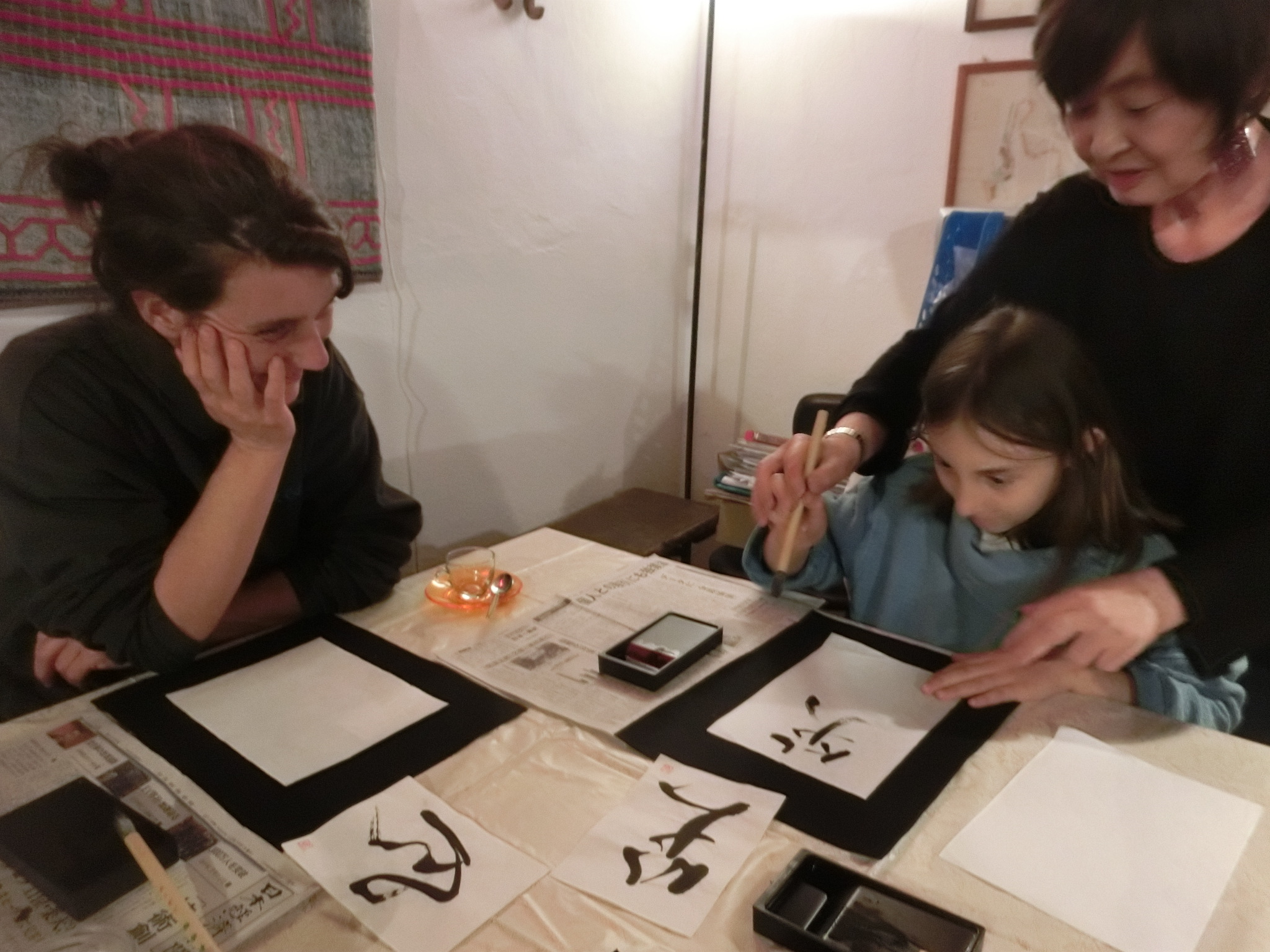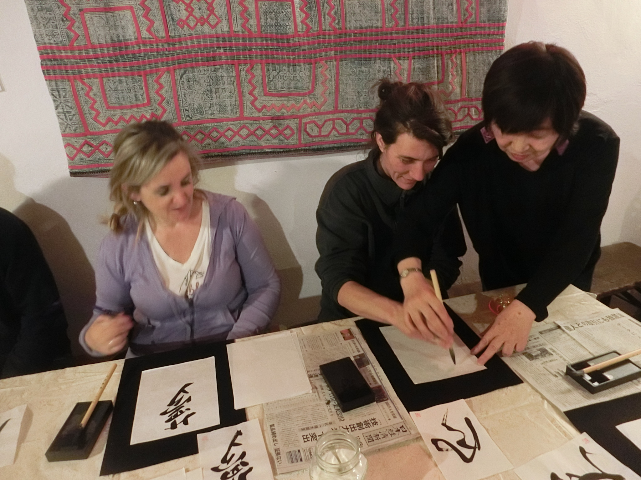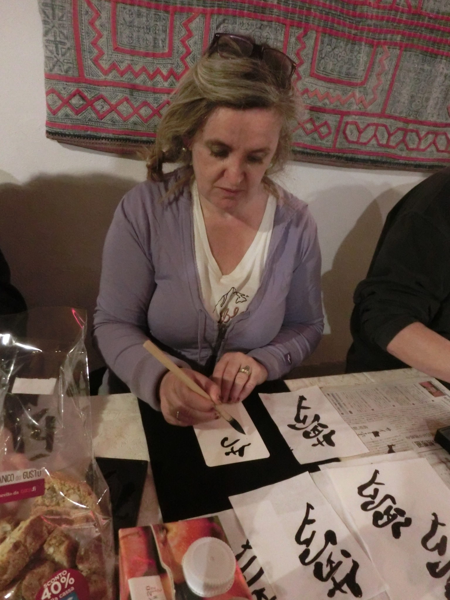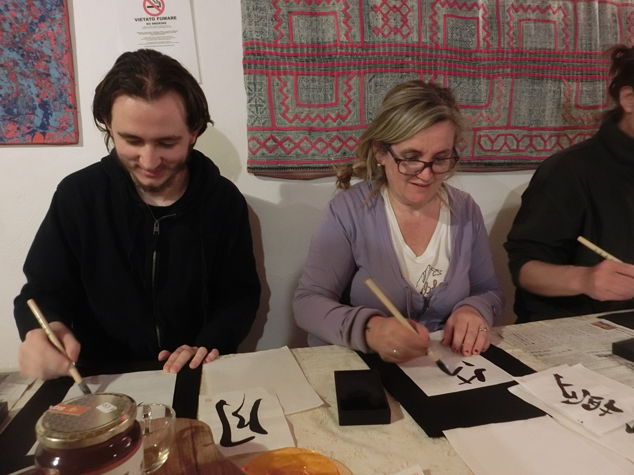 昨晩は、おらが村の休暇の家が日本の空気に包まれました・・・それは「L’Arte Giapponese della Calligirafia」という書のワークショップ!トスカーナ自由自在のリピーターのお客様であるYUKOさんは、日本でも個展に作品を出したり、外国人にワークショップを行う書の先生。今回おらが村滞在の際にもぜひ、とおっしゃっていただき、それに休暇の家のカテリーナが答える形で、今回のイベントとなりました。参加者はカテリーナ、料理レッスンを行うダニエーラと息子さんのガブリエッレ(日本大好き、漫画大好き)、隣町に住む女性とその娘さんの総勢5人!経験豊富なYUKOさんは、下に敷くビニールシート、携帯用すずりに筆など、フル装備で準備して下さいました。