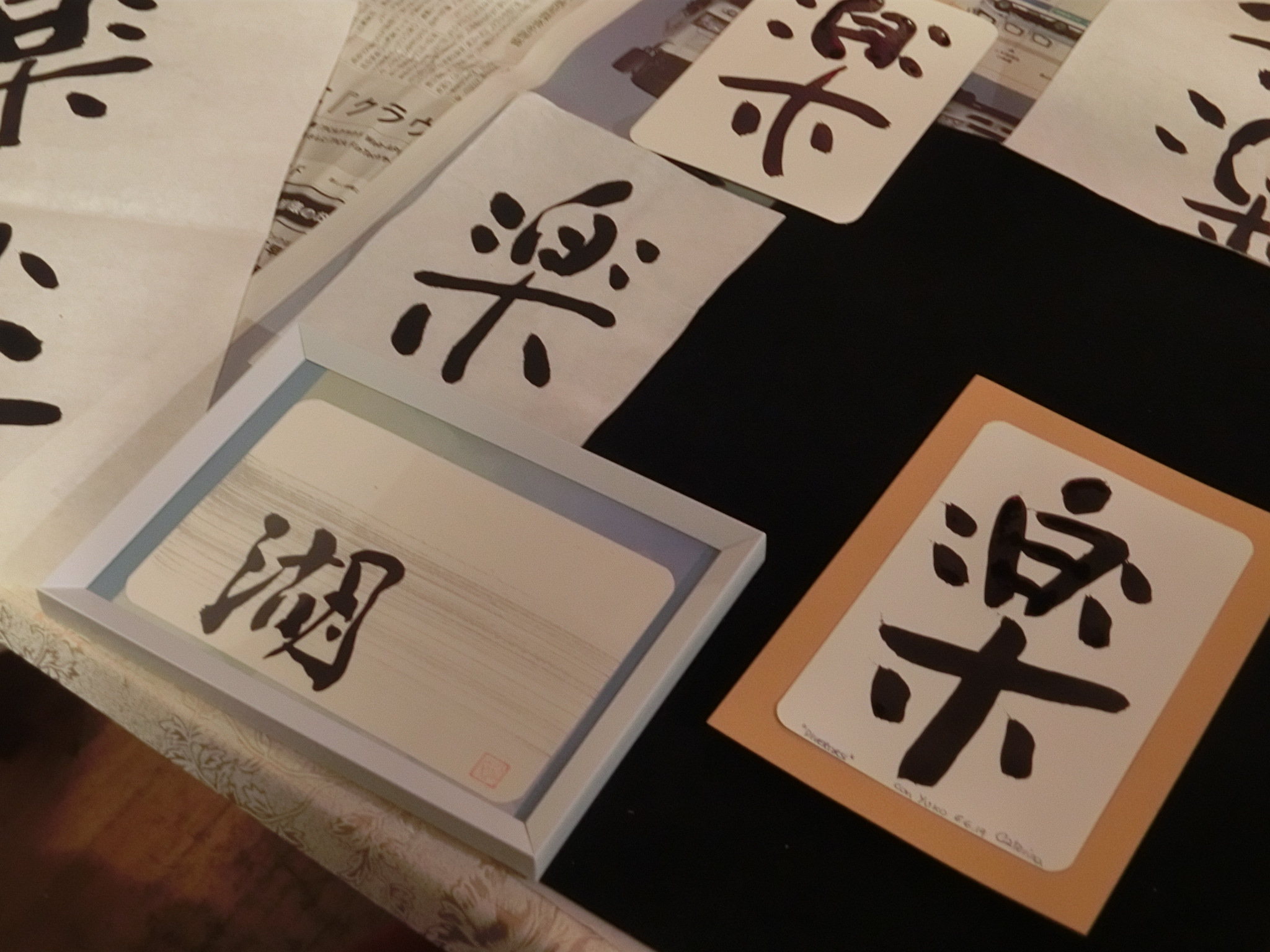 そして次は、先生の用意した漢字から、生徒さんが好きな1文字を選び、練習します。ガブリは月。最初は大き目の紙で、先生と一緒に書いてみます。その後は、練習、練習、練習!最後の紙に書くまでに、少しづつ紙を小さくして、プレッシャーをなくしていく、という配慮も素晴らしい!