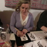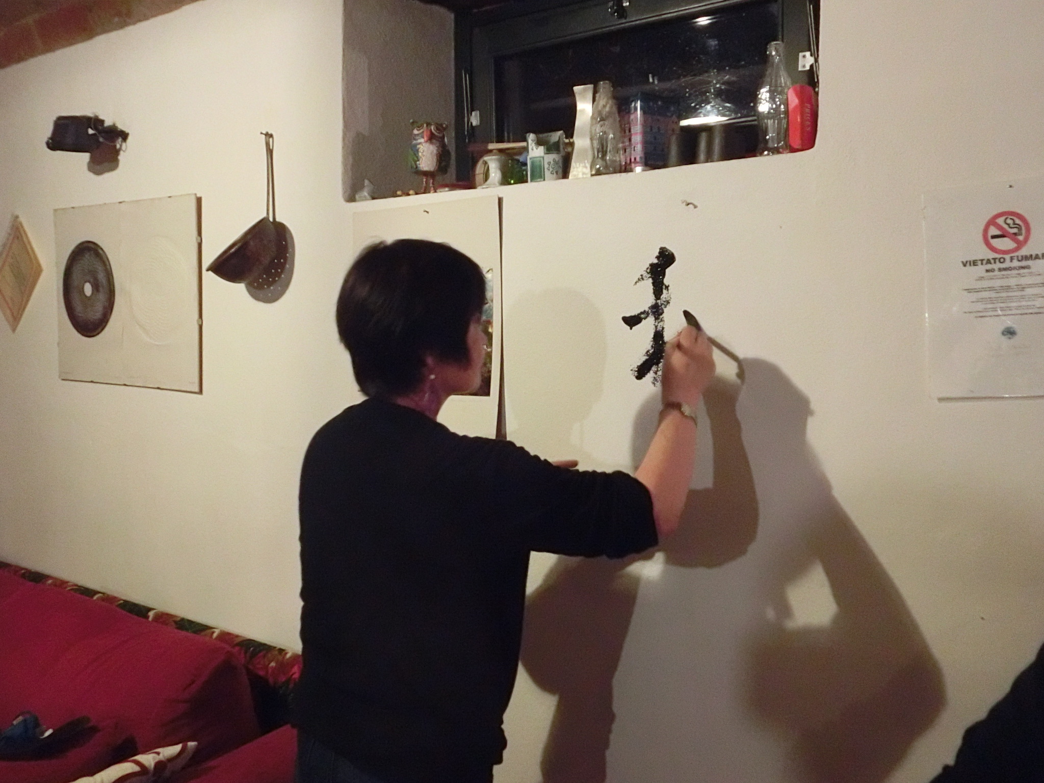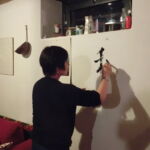 大人も子供も・・・いや、大人も「学生時代に帰ったみたい!」とワクワク、ドキドキしながら一筆一筆・・・その様子がまた楽しい!それぞれの漢字の意味や、何気なく持ってきた日本語の新聞で漢字の成り立ち、そして書の美しさに興味を持ったカテリーナ、最後にすごい提案をしてきました・・・「壁に何か書いてくれる?」これには、私も先生もびっくり!紙ではなくて壁!壁に直接だから、当然書き直しもできないし、一生残るものですからね。