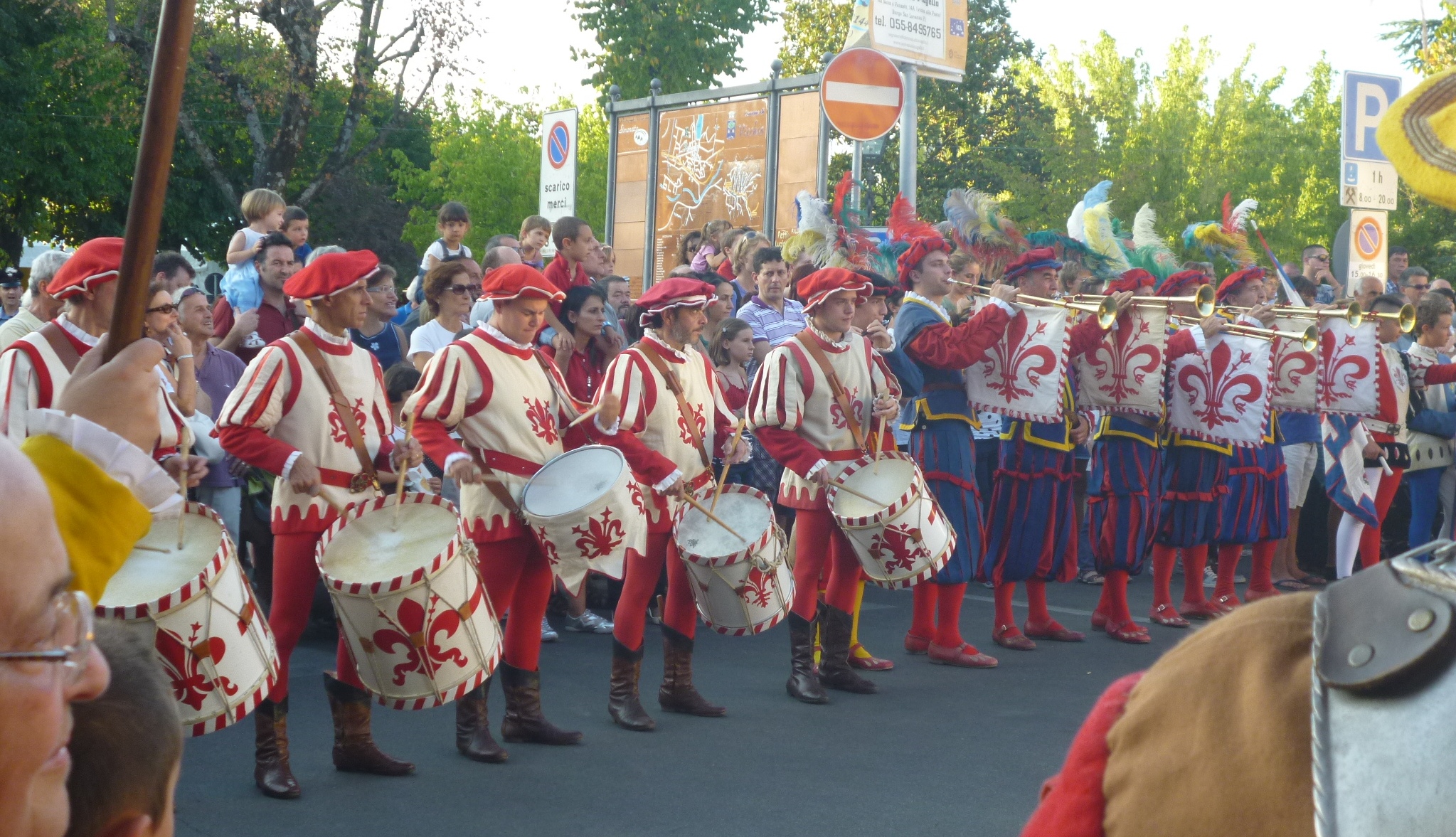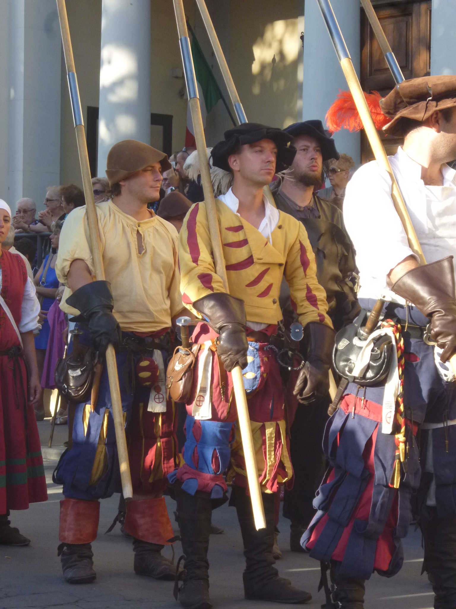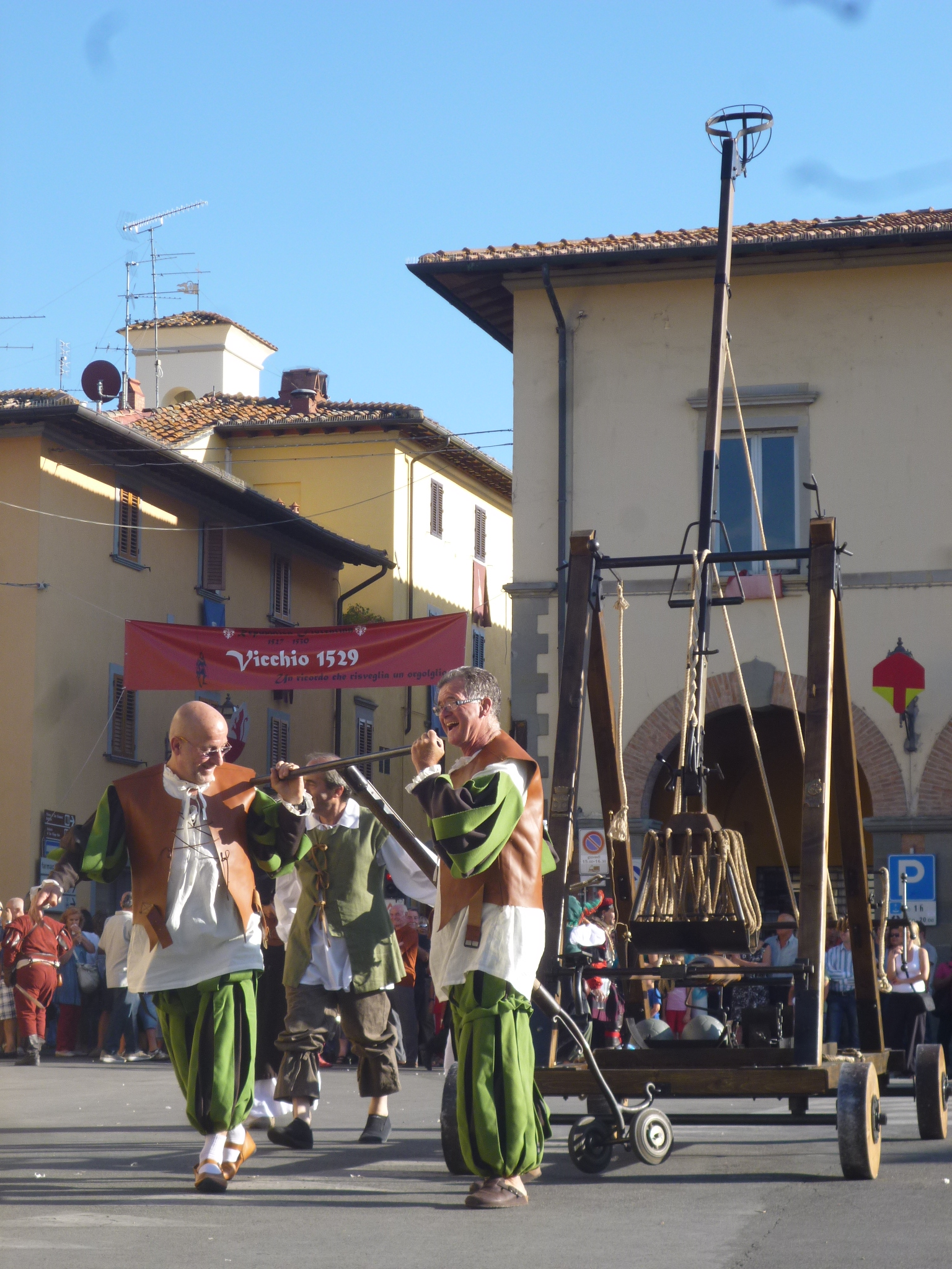 イタリアでは夏、モンテリッジョーニを始め小さな村を中心に中世祭りが行われます。こういったお祭りは行きにくい場所も多いのですが、ここヴィッキオはフィレンツェから直通電車で約1時間、簡単にアクセスができるのが嬉しいお祭り。イベントのサブタイトルは、 Rievocazione Storica=歴史の追憶 、そう 1529という数字は1529年 、この年にこの町で起こった事件に由来しています~1529年、フィレンツェ共和国の忠誠町だったヴィッキオは、攻めてきたスペイン王国軍を前に、数か月も城を守り抜いたとのこと。最後は、大軍のスペイン・砲兵隊の前にたった500名の火縄砲兵はなすすべもなかったようですが、 彼らの精神と強さは今もこの町の誇りとなっているようです。