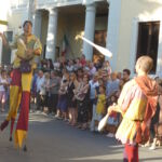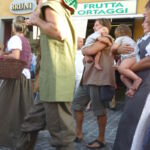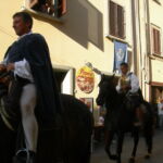 パレードが終わった後、イタリアのお祭りでは定番の旗のショーがちょうど始まったところ。バンドの演奏の後は、大人4人のショー、それから少年2人のショー(まだ上手じゃないので、見ている人も親の気持ちでハラハラしながら見てしまいます)、それから大人のワンマンショー、見事に2本の旗を使ってのショーは素晴らしいです。最後は大人8人のショーがあり、パレードをした皆で挨拶、で終了!だったのですが、この挨拶の時に人ごみから2人の子供が駆け寄って・・・この子たちのお父さんはショーの騎手で、きっとお父さんのスゴイ所を見て感動しんでしょうね。
