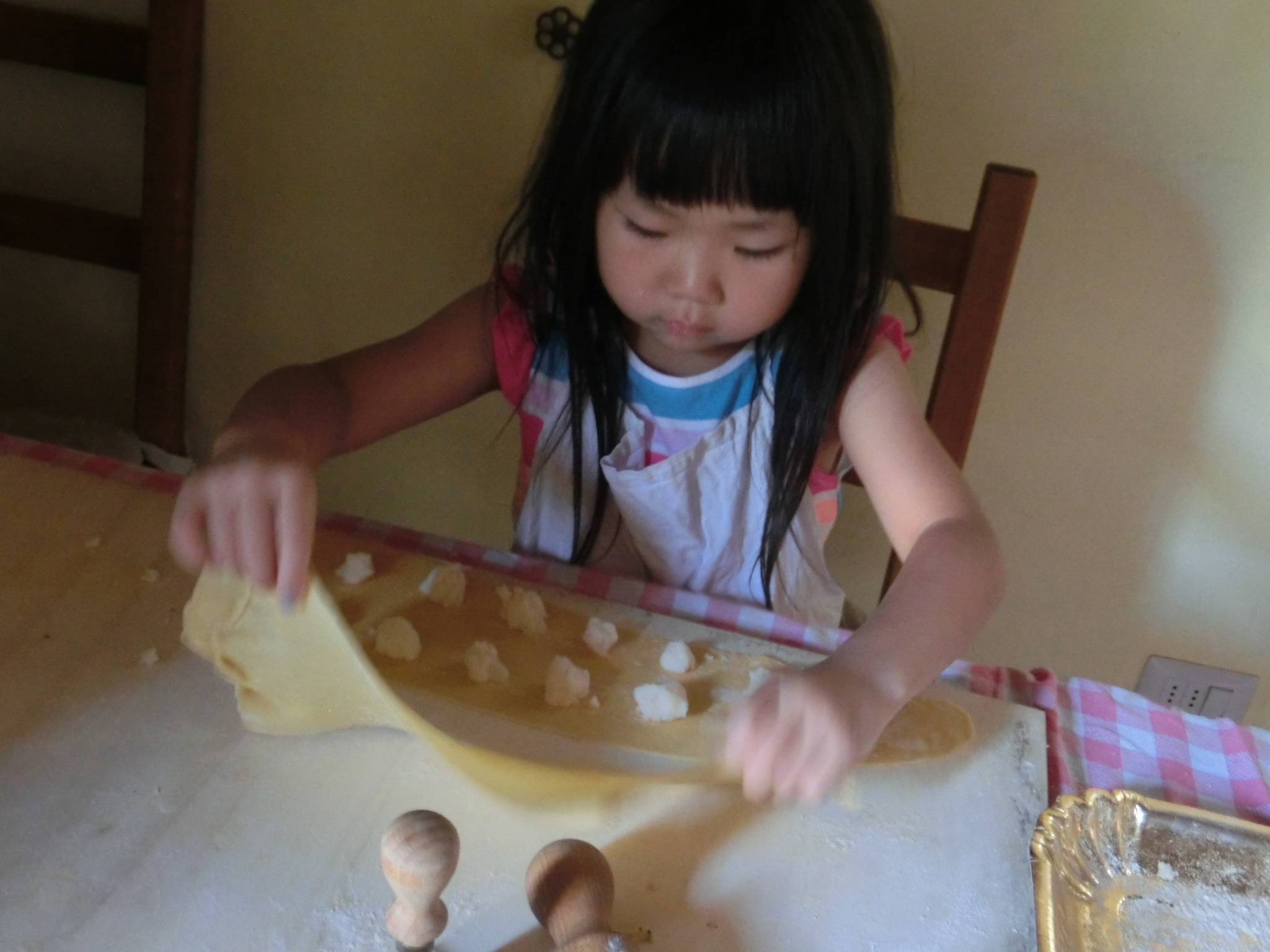 休暇の家から合流した私とも、到着したばかりのダニエーラ宅でも・・・料理レッスンの初めの方も、一緒にやるんだけど、お顔はぎこちないまま・・・💦 生地コネコネのあとは、まず、麺棒で伸ばしてみます。そして具を入れて切っていく作業に入り、パスタカッターで切るのがなんとなくお気に入り?のよう。