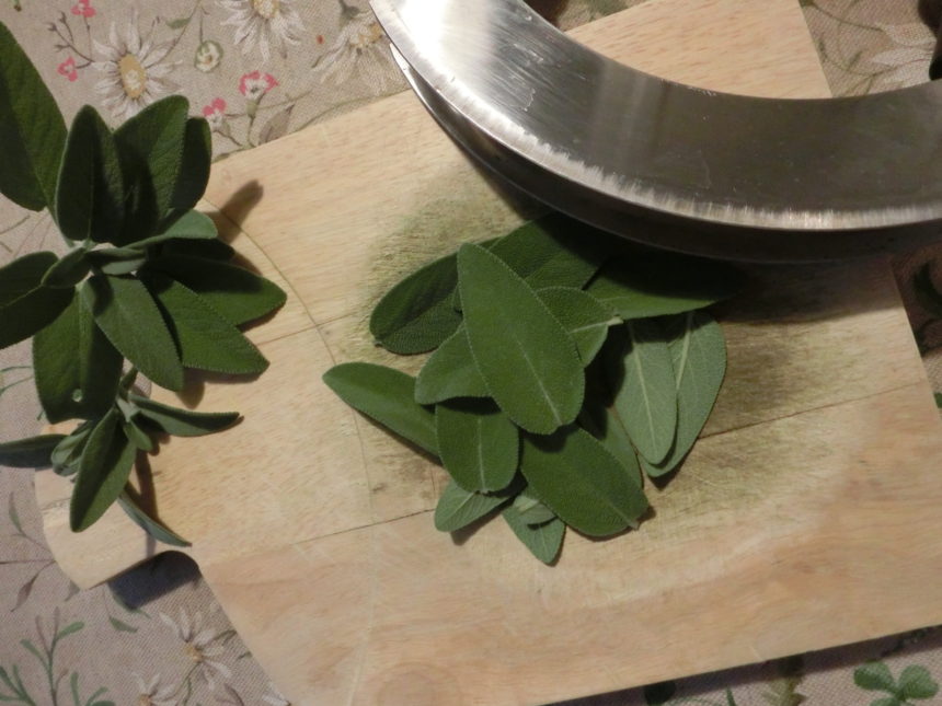 この2枚刃のメッザ・ルーナは、おらが村に越して来てすぐ、たまたま見つけたもの。しかも、真ん中がくぼんだ専用まな板とセットで2.50ユーロと破格だったので買ったのですが、本当に重宝しています。ハーブ塩を作る時はもちろん、この日は「セージをたんまり使った鶏肉料理」でセージを切りました。