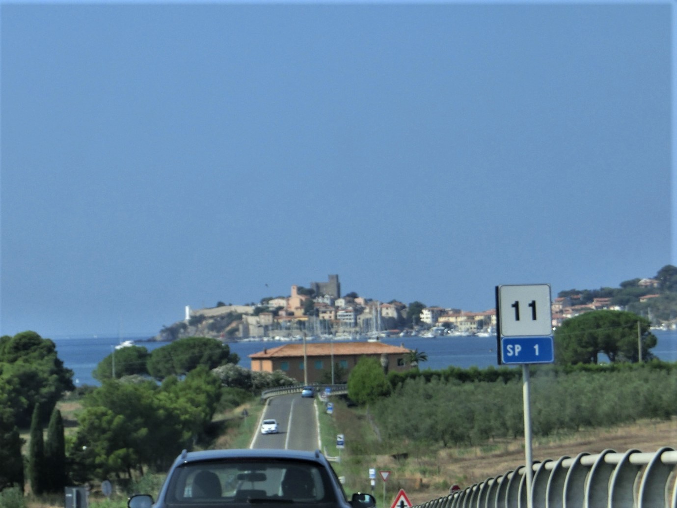 南にはモンテ・アルジェンタリオの半島、そこから西に目をやると、遠くにジリオ島も見えます。そして下に目を移すと、Top 写真のビーチが。