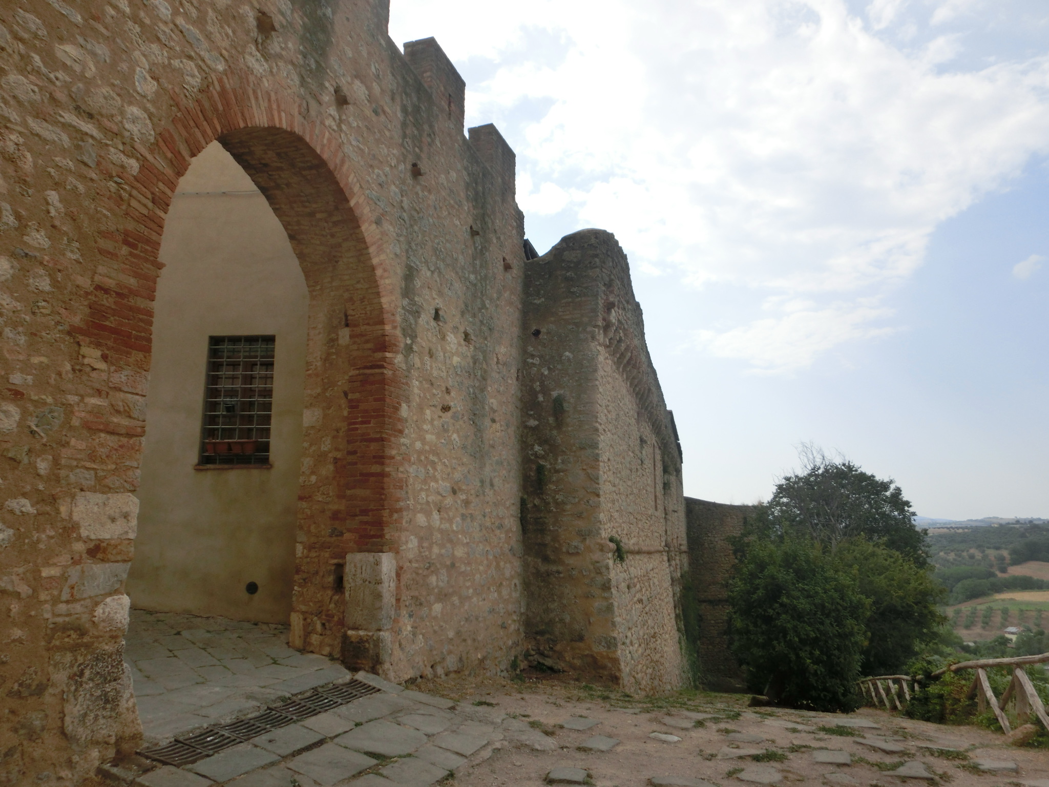 この城壁ができたのは、中世、当時この地を治めていたアルドブランデスキ家の時代です。その後、ルネサンス期にはシエナ共和国支配下にはいり、この城壁も改修されます。その後は現在のトスカーナの原形となるメディチ家のトスカーナ公国に併合されますが、この立派な城壁は今も500年以上前の形をとどめているのです(一番奥の塔のみ近年再建築)。