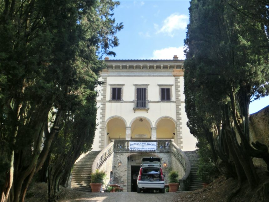 訪問時はキアンティ・ルフィナの祭り「BACCO」開催中で、ヴィッラの中や地上階のエノテカには入れませんでしたが、周辺や裏側のテラスには市民が散歩する雰囲気。ヴィッラの隣の建物は「キアンティ・ルフィナワイン生産者協会本部」になっており、祭りでは、キアンティ・ルフィナの生産者のスタンドが並びます。裏のテラスから見るルフィナの町は、こんな感じ~祭りの中心はこのヴィッラと、鐘楼が見えている教会のある広場になります。